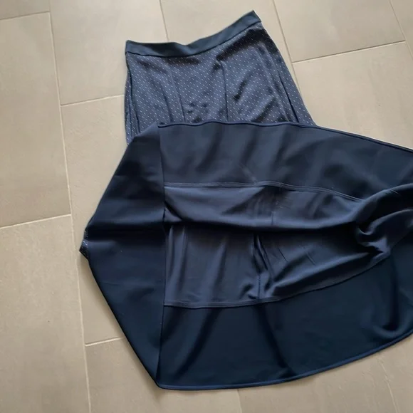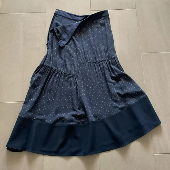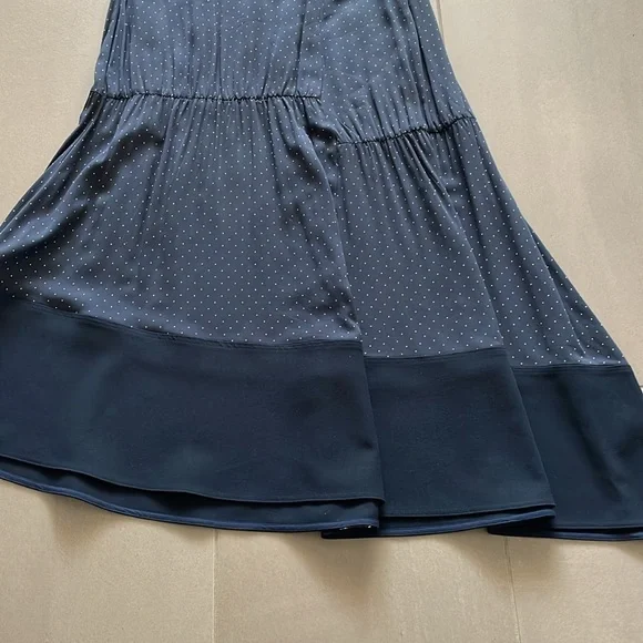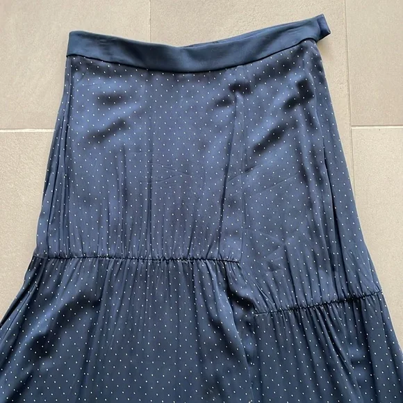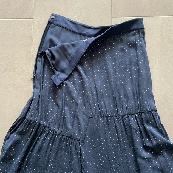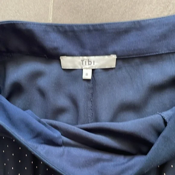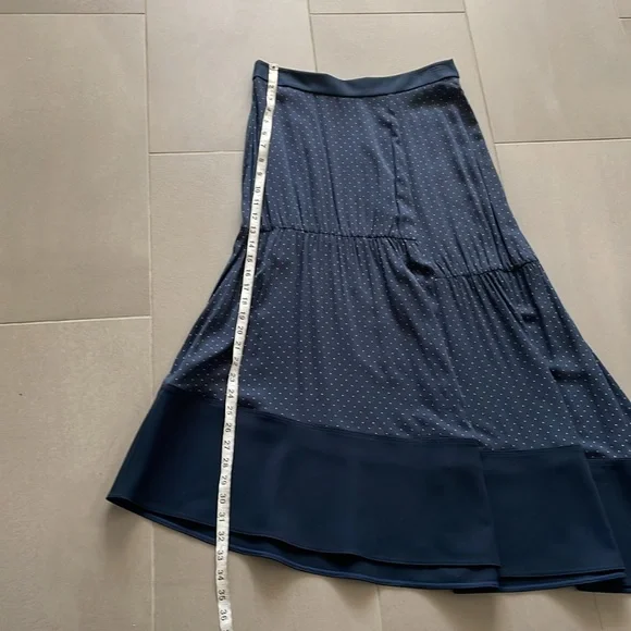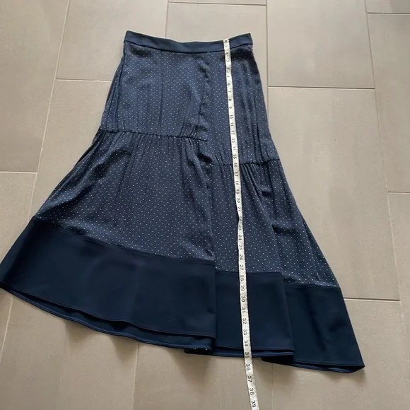 This Tibi skirt features a stunning blue hue and a flattering midi length, perfect for casual or resort wear. Its A-line silhouette is enhanced by pleated, tiered layers that add movement and style. The lightweight fabric and fitted waistband ensure comfort and elegance for any relaxed occasion.Hardly worn excellent condition