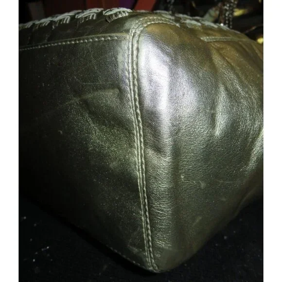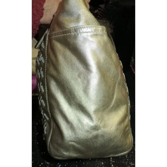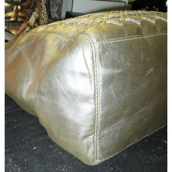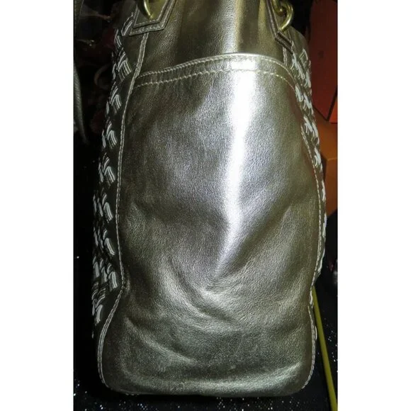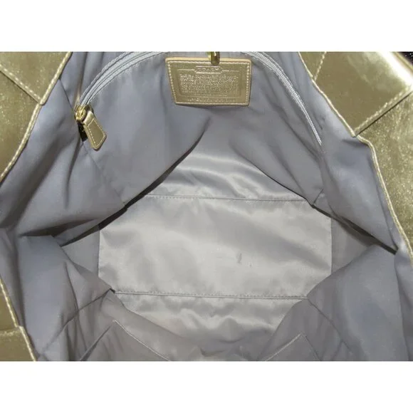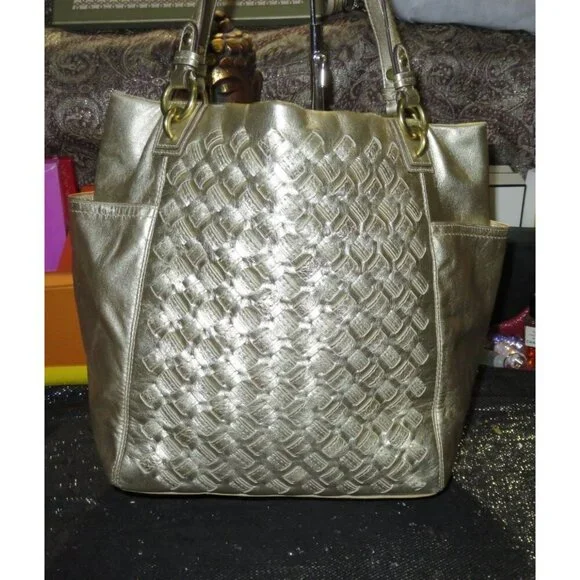The COACH 2011 Peyton North South Woven Metallic Gold Leather Tote Handbag 17099 is a stylish tote. Made with metallic gold leather, this woven style bag measures 11 X 12, providing ample room for everyday essentials.Used but cared for/ I removed a couple of rogue pen marks completely!!All used bags/shoes may have the following✔️Discoloration✔️Signs of use✔️Scratches scuffing✔️rubs✔️Pls check the pictures closely as they are part of the description.