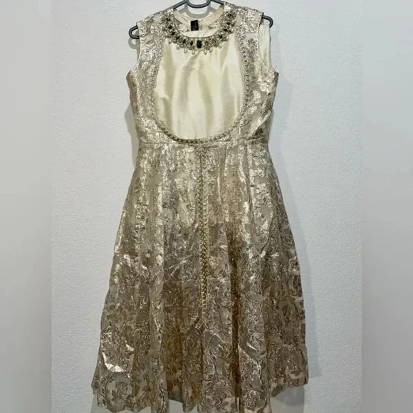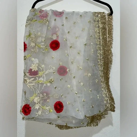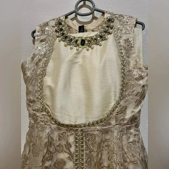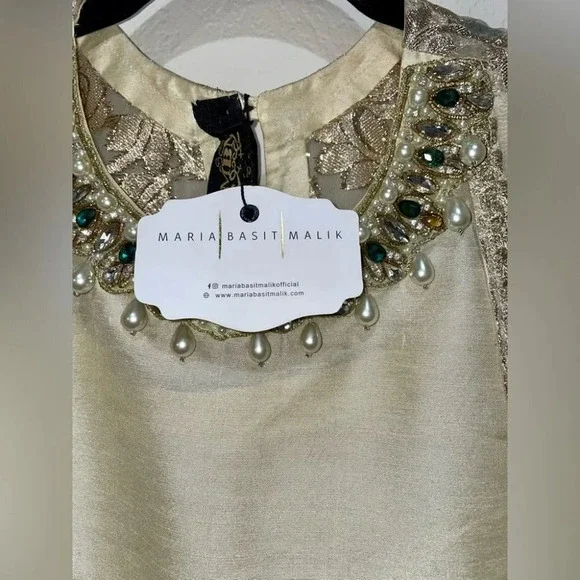 Maria Basit designer peshwas with full length gown style frock with embroidered lehnga/skirt. The dupatta is fully embroidered with flowers and thread work. The neck is embellished with emerald gems. All work is intricate, hand-done, and completely unworn. Tag is intact.Open to reasonable offers. No low balls.