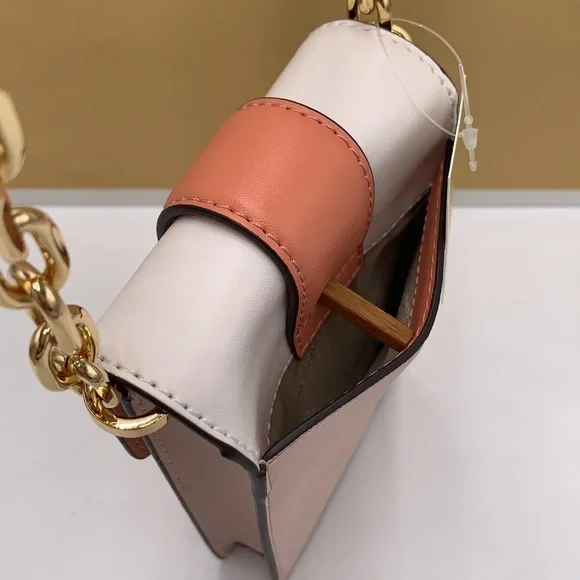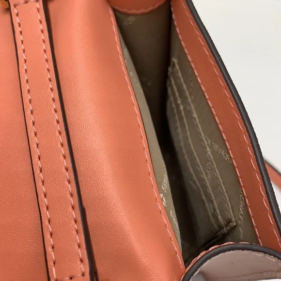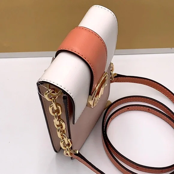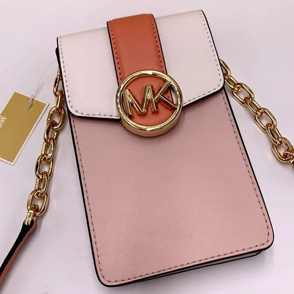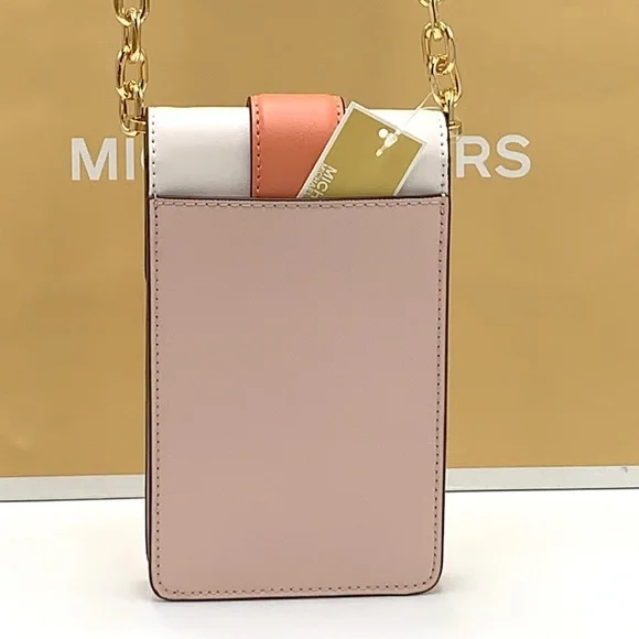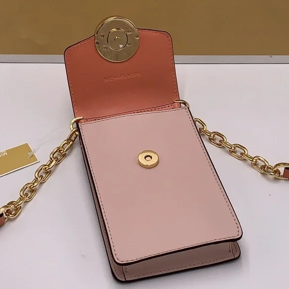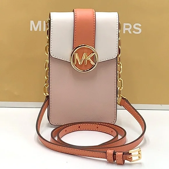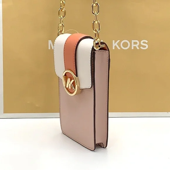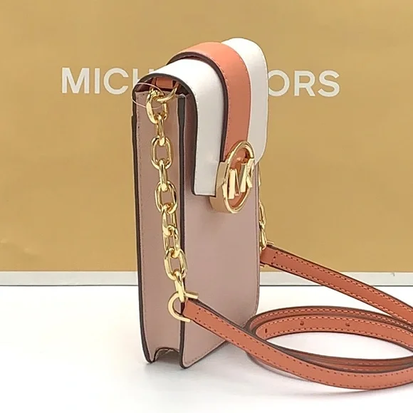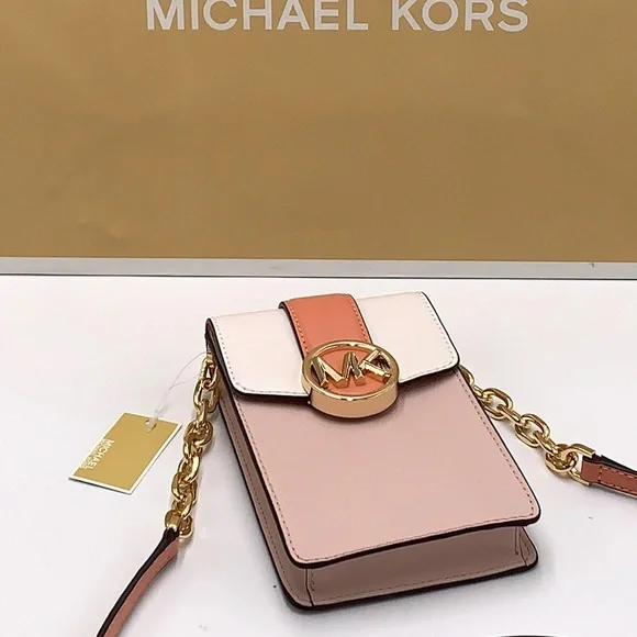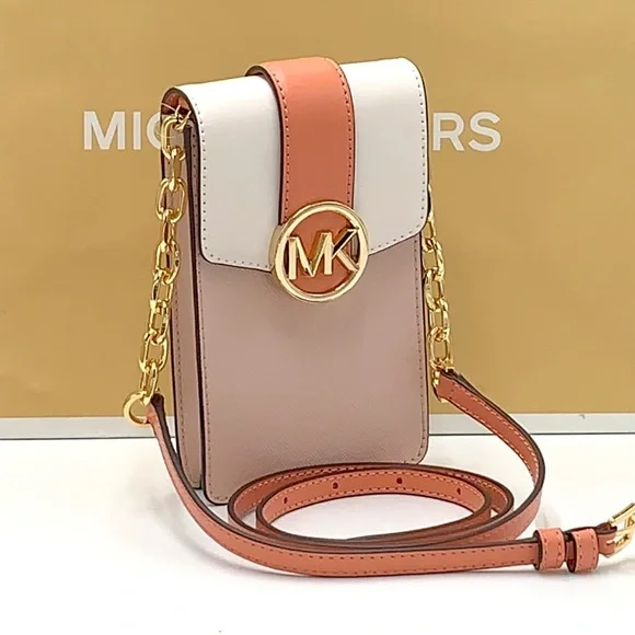 NWT MICHAEL KORS CARMEN SMALL NORTH SOUTH PHONE XBODY POWDER BLUSH MULTI COLORReimagined in a shrunken silhouette, this version of our beloved Carmen bag will stylishly keep your phone and card case within arm’s reach. It’s designed in faux leather with a color-block finish. The high-shine hardware amps up the luxe factor, while its crossbody strap can be adjusted to the perfect length. Wear it from day to dark with ease.DETAILS• Crossbody bag • Powder Blush multi color • Faux Saffiano leather • 88.92% coated canvas/11.08% polyester • Trim: 100% polyurethane • Gold-tone hardware • 4.25”W X 7”H X 1.25”D • Interior details: 3 card slots • Lining: 100% polyester • Snap fastening • Imported
