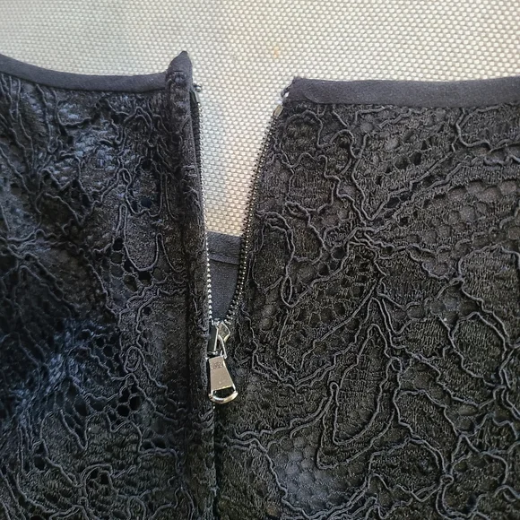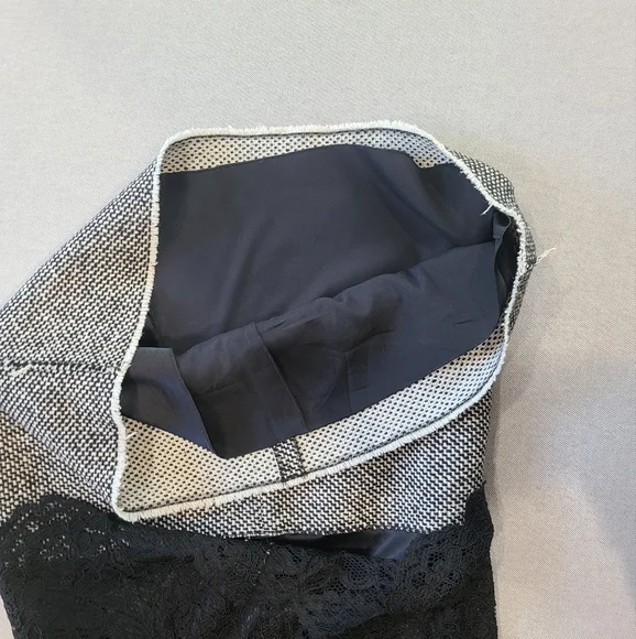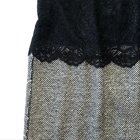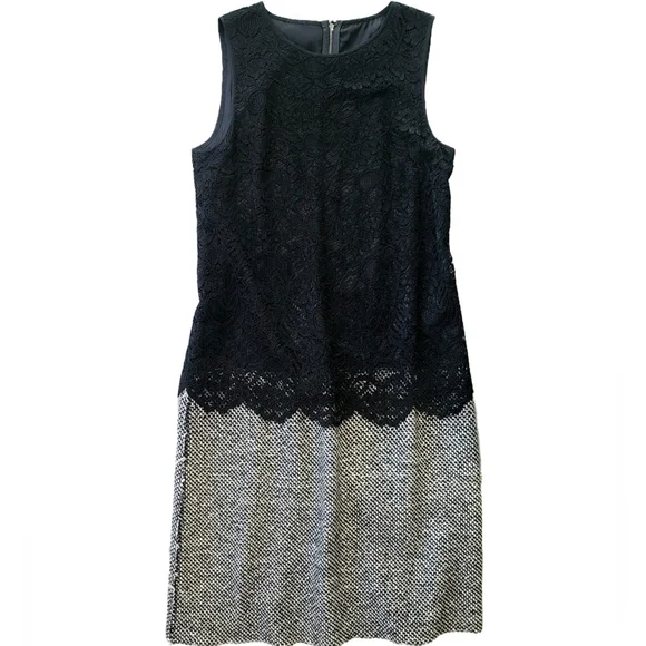 Leave it to this iconic Italian duo - mixing cream with delicate scalloped laceDramatic contrasting sleeveless /slightly a-line sheath dressbeautifully embroidered black lace Trimmed in silk at neck and sleeve openings. Unfinished side seams and hem create a rustic look on the black and off white Tweed skirtFully lined in stretch silk charmuese -the epitome of luxuryA Perfect juxtaposition for office to drinksIn excellent condition no visible signs of wear17 bust17 waist20 hip34 length