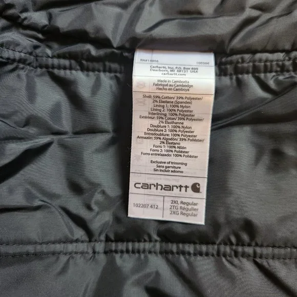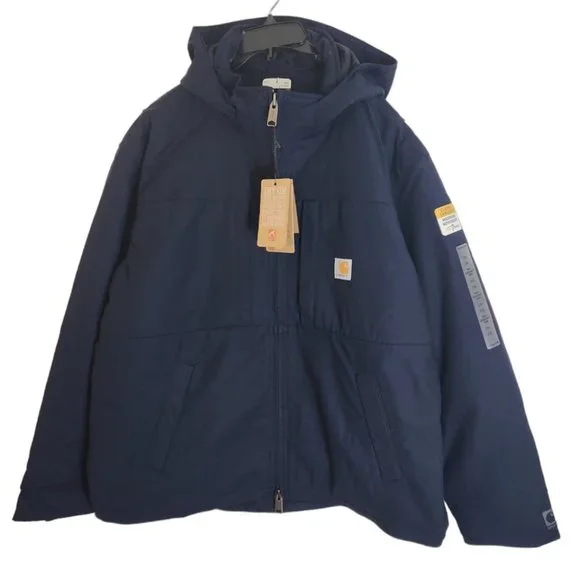 CARHARTT MEN'S FULL SWING CRYDER WORK QUICK DUCK WORK JACKET NWT59% Cotton / 39% Polyester / 2% Elastane Quick Duck canvasFull zip front with mock collar and detachable hood80 gram 3m Thinsulate insulation for warmthQuick Duck light durable canvas fabricFull Swing gear designed for maximum range of movementRain Defender durable water repellent technologyInternal rib knit storm cuffs with ergonomically shaped sleeve hems to keep out coldDrawcord adjustable droptail hem for added coverageTwo chest zip pockets with two hand pockets and hidden snap closureWash and dry inside out and tumble dry lowStyle: 102207-BLUE