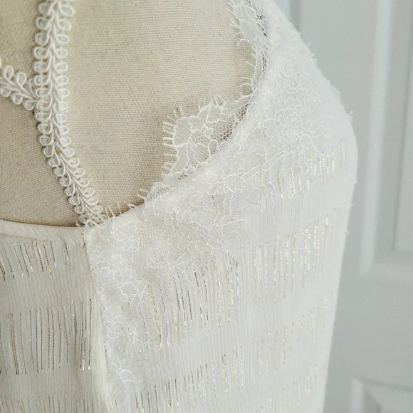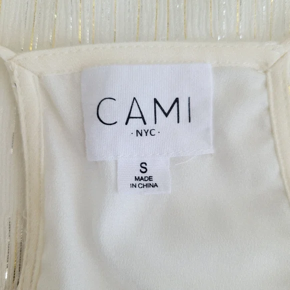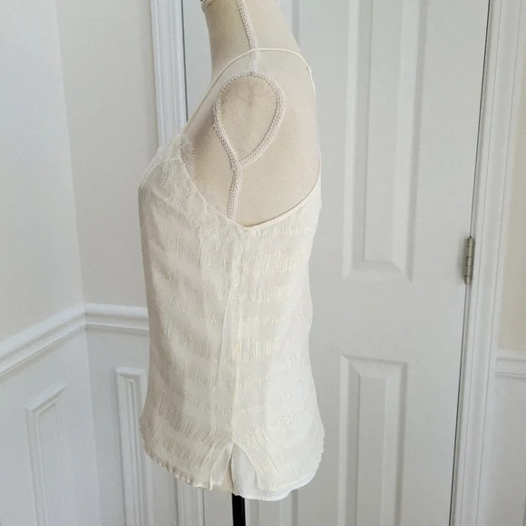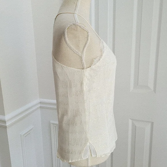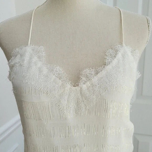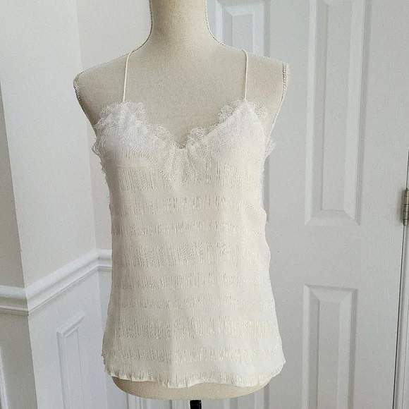 Crafted from a luxurious silk blend, this elegant tank top from Cami NYC features delicate lace trim along the neckline and ultra-thin spaghetti straps for a feminine touch. Perfect for layering or wearing solo, its subtle shimmer and flattering fit make it ideal for both casual and dressy occasions. It is in great preowned condition. Size SArmpit to armpit: Approx. 16.5"Length: Approx. 23"