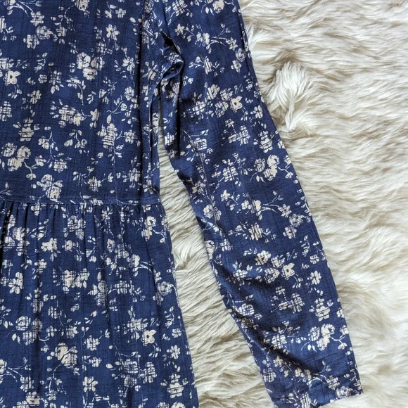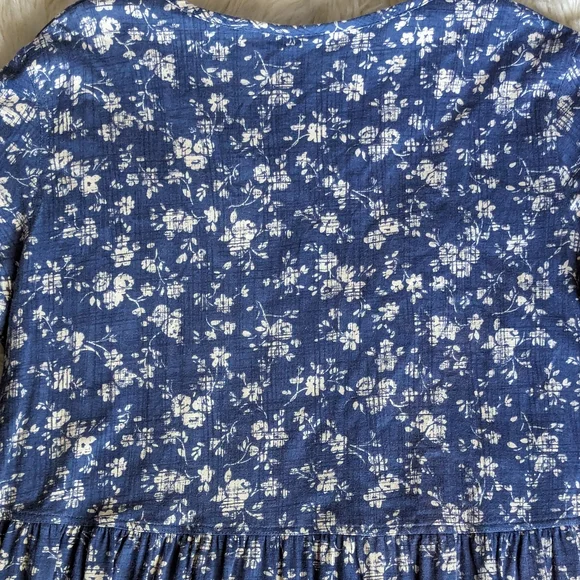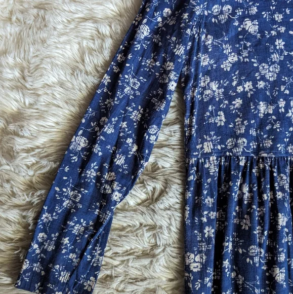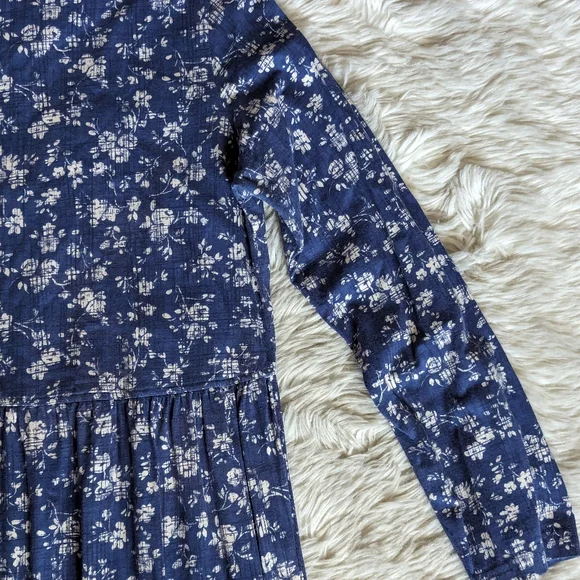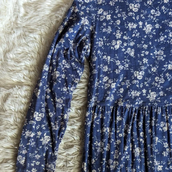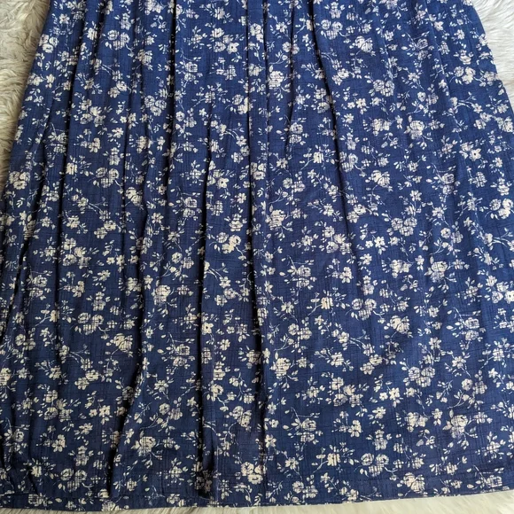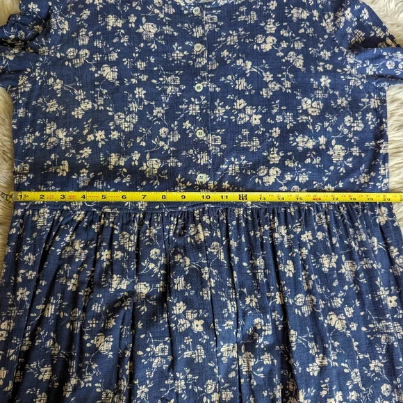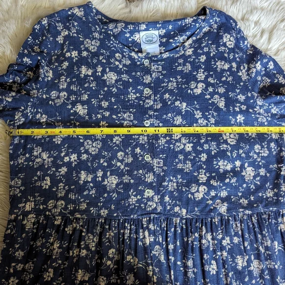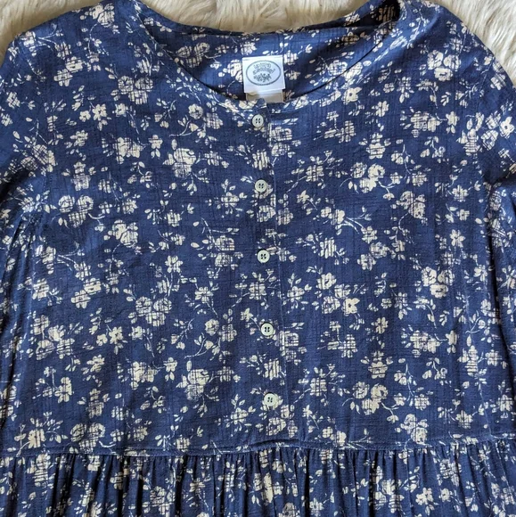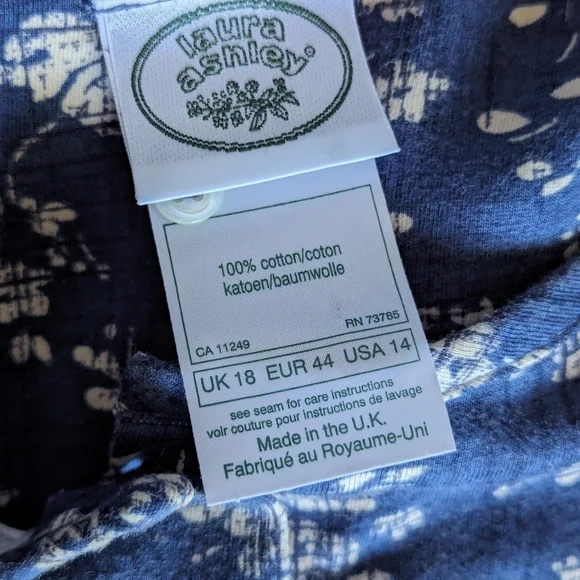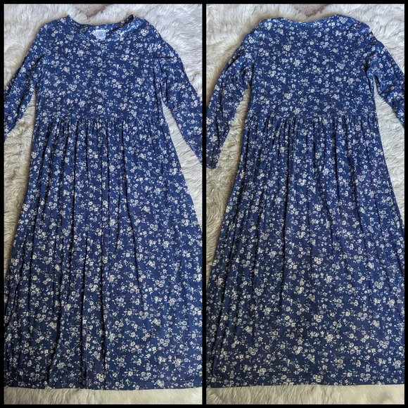 This dress is in great pre owned condition for being vintage. The last photo shows a close up of the true more beige and blue color combo. My photos are in natural light so it may look slightly brighter. This is fully cotton, long sleeves, has a half button front with an empire waist and full bottom skirt. Size is 14 US, Vintage Laura Ashley.Vintage Cottagecore Prairie Cotton Transitional Weather Fall Unique Floral 80s