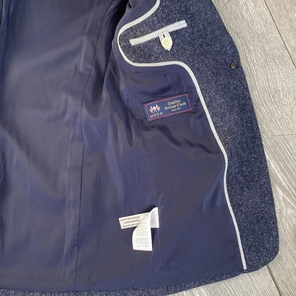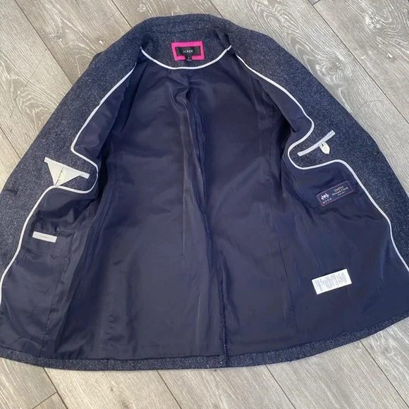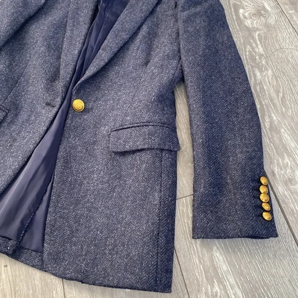 Great condition J.Crew Long Parke Blazer 2 Navy Herringbone English 100% Wool Classic Preppy Academia Scholar Career School Casual. Please read measurements. -100% Wool.-Peak lapel with undercollar felt-Functional buttons at cuffs-Single breasted.-Welt pocket with flaps-Interior pocket-Lined-Dry clean-Import-Abraham Moon & SonsChest pit to pit 16.5".Length 29'.Sleeve 23".