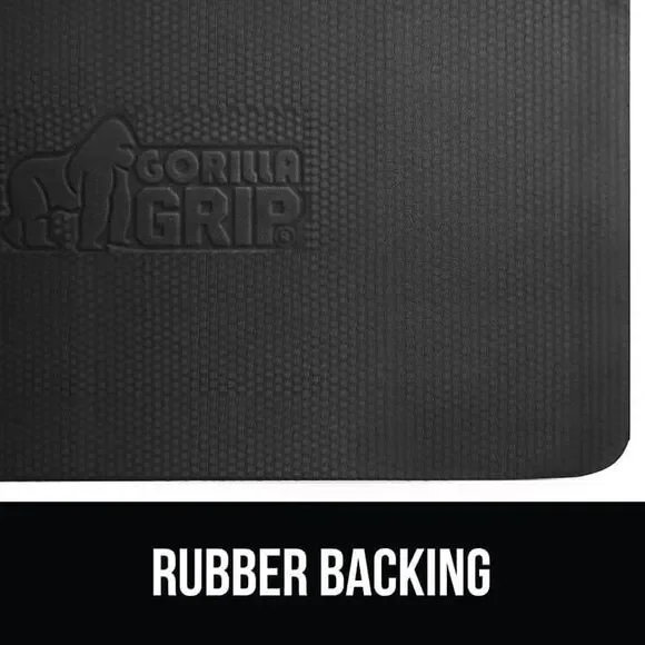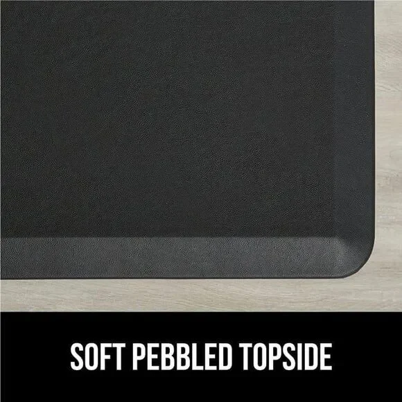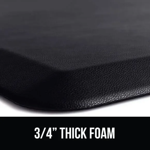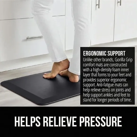 Gorilla Grip Anti Fatigue Cushioned Kitchen Floor Mats, Thick Ergonomic Standing Office Desk Mat, Waterproof Scratch Resistant Pebbled Topside, Supportive Comfort Padded Foam Rugs, 32x20, BlackAbout this itemUltra Thick and Supportive: designed with three quarter inch thick premium grade foam for all day comfort; soft cushioning combined with strong rebound helps relieve tired feet and anklesHelps Relieve Pressure and Fatigue: high density foam construction provides superior ergonomic support to help keep you comfortable; antifatigue mats can help to relieve pressure and reduce fatigue throughout the dayStain and Scratch Resistant: pebbled topside is stain resistant and easy to clean; durable scratch resistant surface is ideal for active homes and tough enough life’s everyday messes; simply vacuum or wipe with a damp cloth to cleanRubber Backing: unlike other brands, Gorilla Grip comfort mats are constructed with a durable, SB rubber backing that won’t break down over time