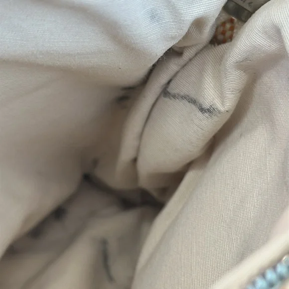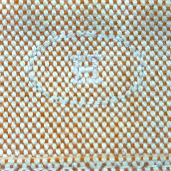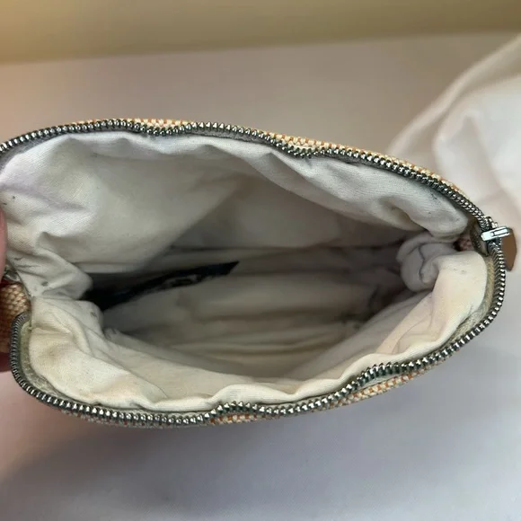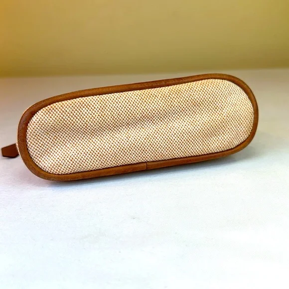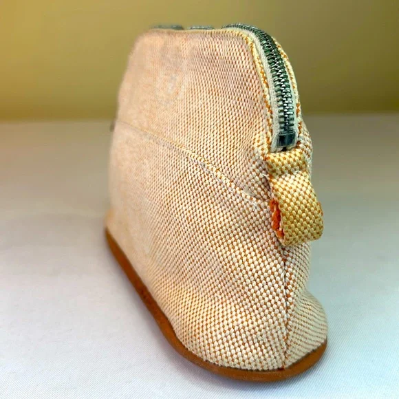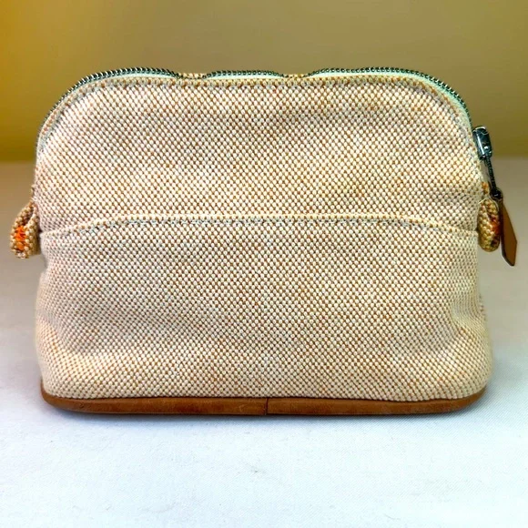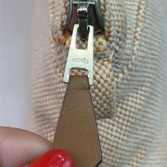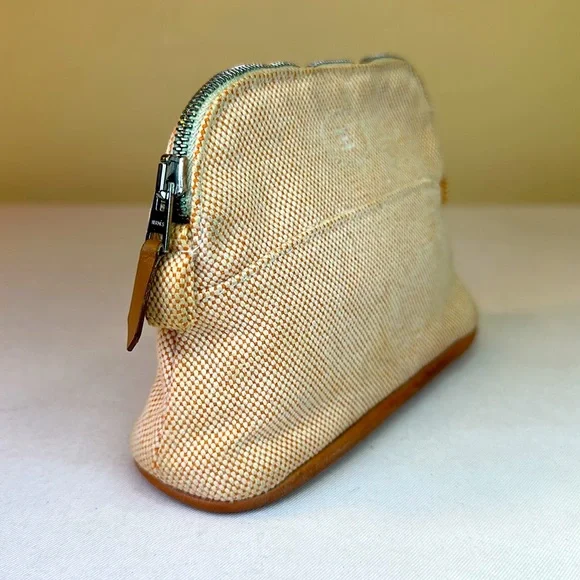 Hermes Bolide Mini rare colorway of Hermes Orange and cream cotton. Made in France. H logo on front. Silverton zipper with leather pull. Leather bottom trim is clean. Cream cotton interior has some marks from pen in bottom corners. Perfect size for credit cards, cosmetics.Cleaned. This is a preowned item and may show signs of wear including scuffs, scratches or discoloration. Final sale