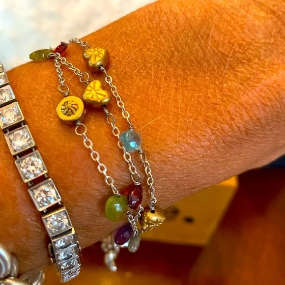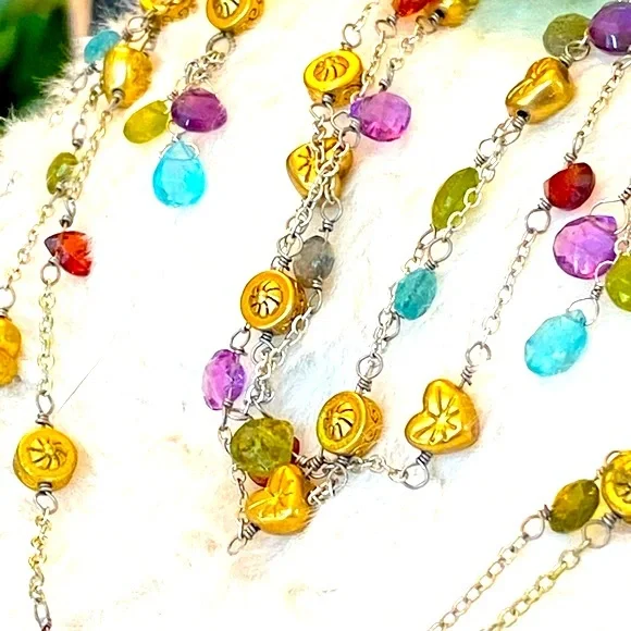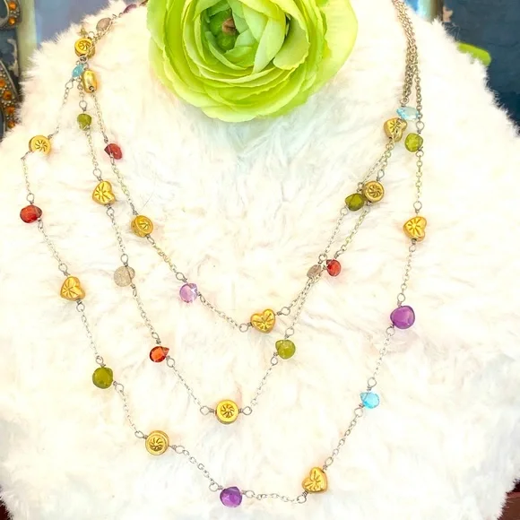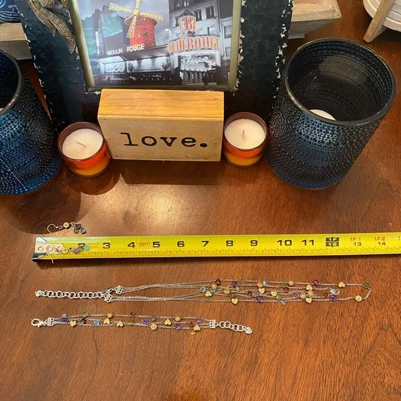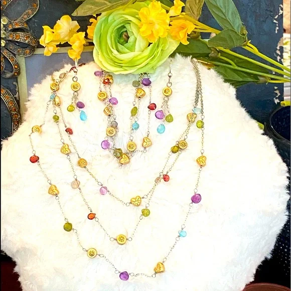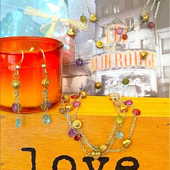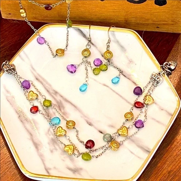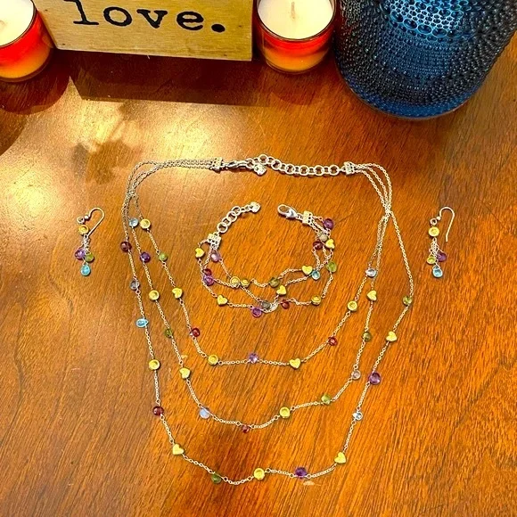 Ultra Rare HTF Retired Brighton “EYE CANDY “ Necklace, bracelet & earrings! This set features adorable delicate gold plated Heart/Beads, genuine Faceted semi precious stone briolettes, (milky apatite, Garnet, Amethyst, Labradorite & Vessonite) Necklace and Bracelet are three strand so you get the layered look! Perfect for a pop of color to any outfit! I just love the semi precious stone pieces grab this before I change my mind it’s one of my all-time favorites! Shop my closet for more rare Brighton treasures you’ll love!Many rare Brighton collections to choose from not found in stores for that special gift, or treat for yourself to bring memories for years to come.Come in and see the Brighton difference affordable luxury for everyone."LIKE" ♥️your favorites to be notified of sales!Bundle your likes ♥️receive special promotions mentioned!Now let's get shopping! 🛍️ 🛍️🛍️Valentine’s Day, Spring, summer, vacation, Mother's Day, graduation, prom, wedding, memorial day, 4th of July, date night, girls weekend, Thanksgiving, Easter, Christmas, New Year's Eve, and many many more wonderful times to celebrate with special jewelry.GemstonesSummerAutumn SpringVacationMother's DayGraduationVintageBohemianCrystalBirthdayRetroBohoVintageRomanticChristmasHolidayMagicalCrystalsLove