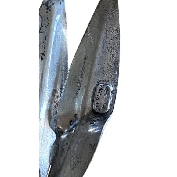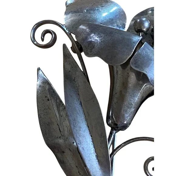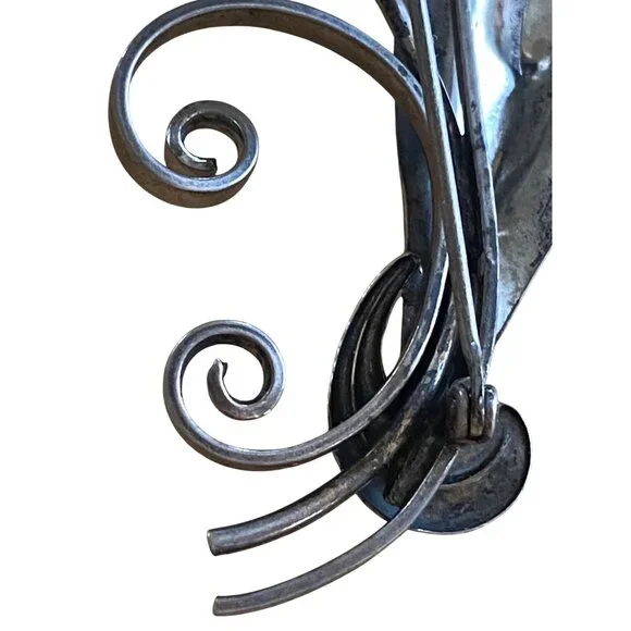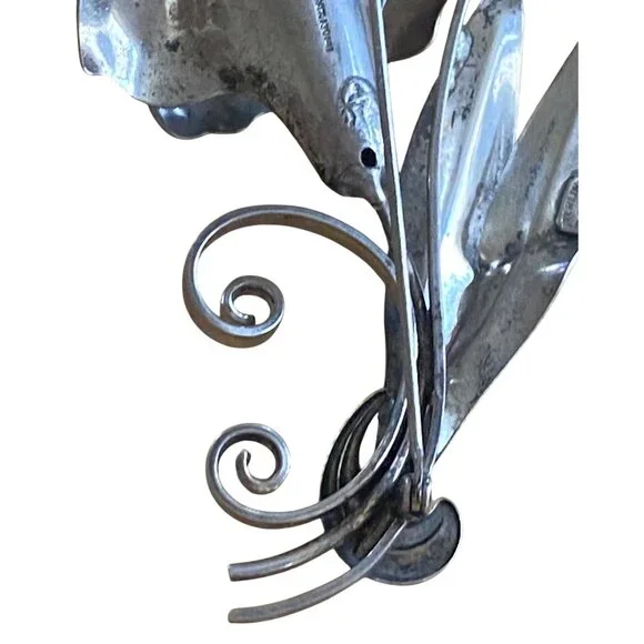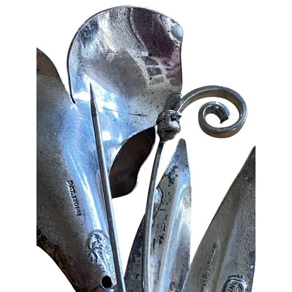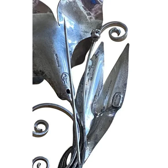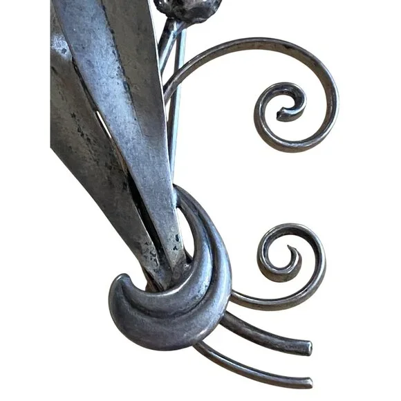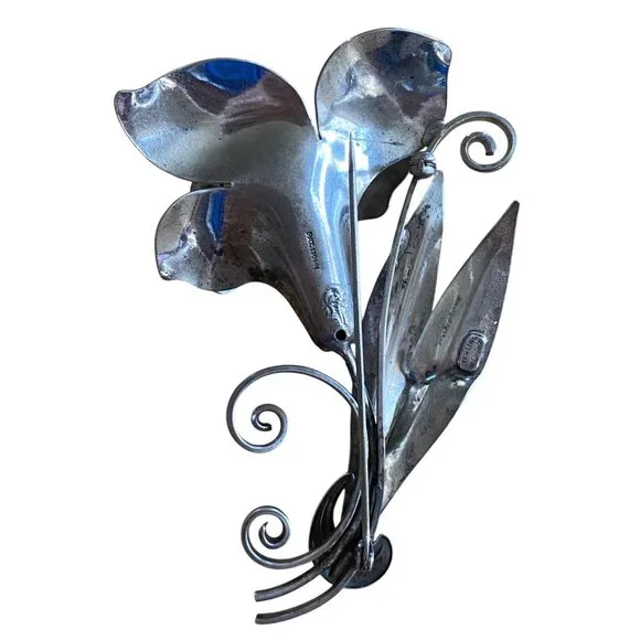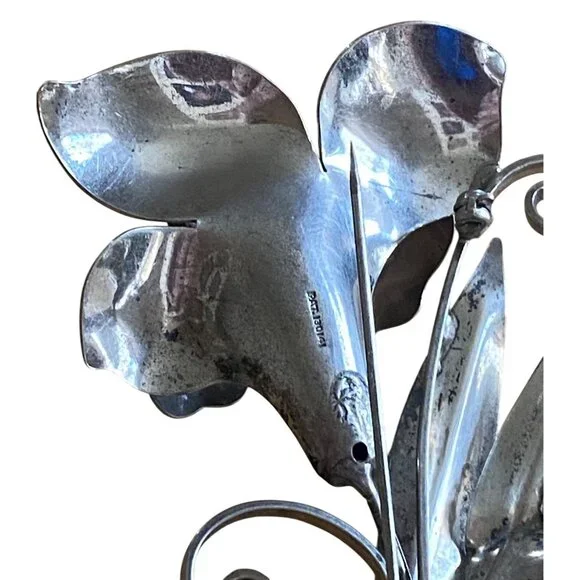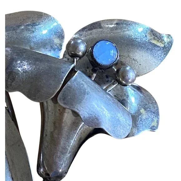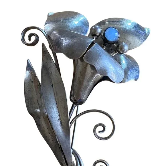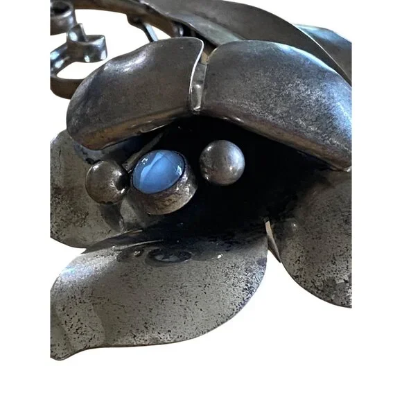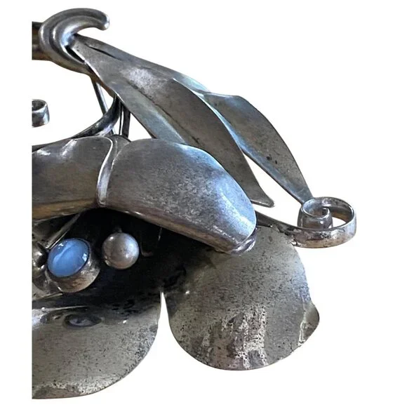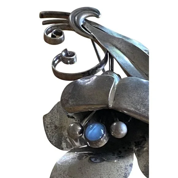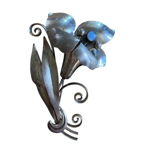 This elegant vintage brooch features a striking floral design crafted from sterling silver, adorned with a captivating blue gem. Its intricate detailing showcases fine craftsmanship, making it ideal for adding a touch of sophistication to attire. The brooch's secure pin closure ensures it stays in place.• Sterling silver construction• Intricate floral design• Secure pin closure• Blue gemstone feature• Vintage piecePatina consistent with age on the silver surface.Condition: Pre-Owned GoodSee pictures.Gemstones tested on Presidium Gem Tester II.Precious metal tested with JSP and GTE Gold Silver Jewelry Tester Appraisal Kit.Daily uploads of new items!