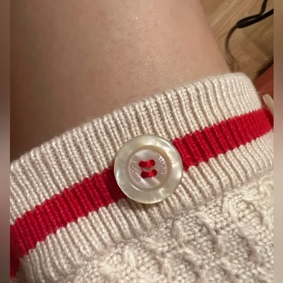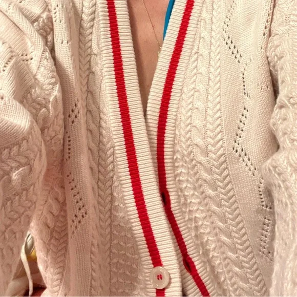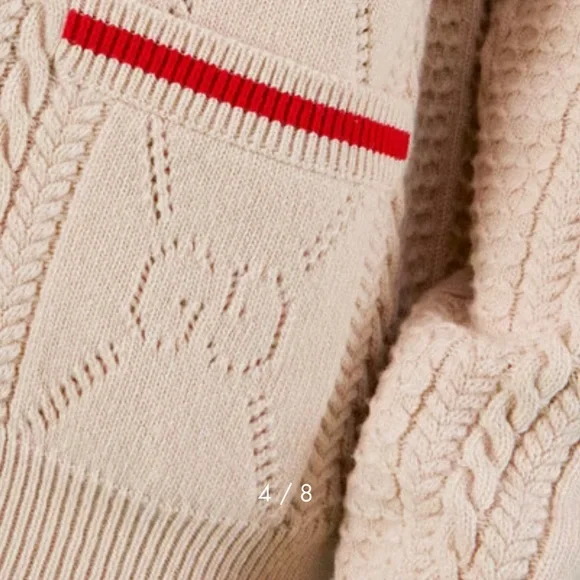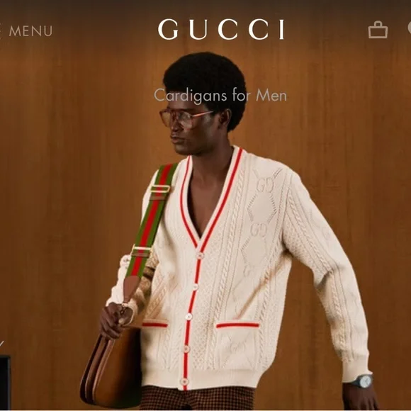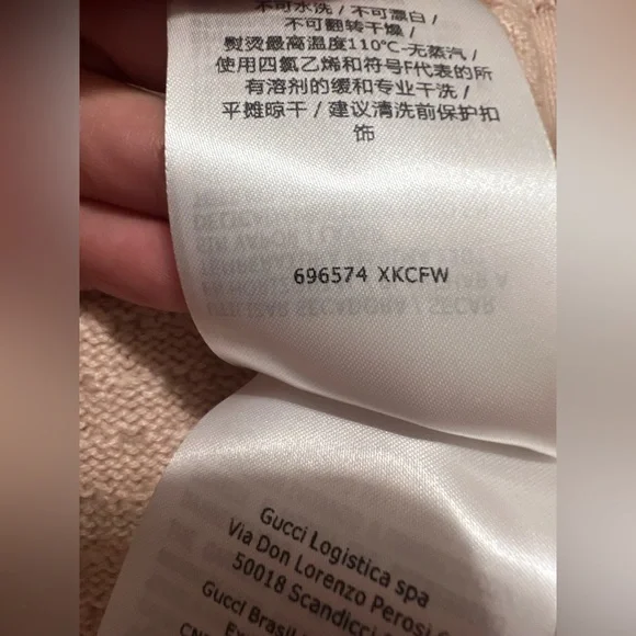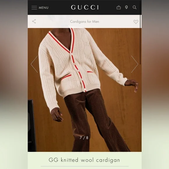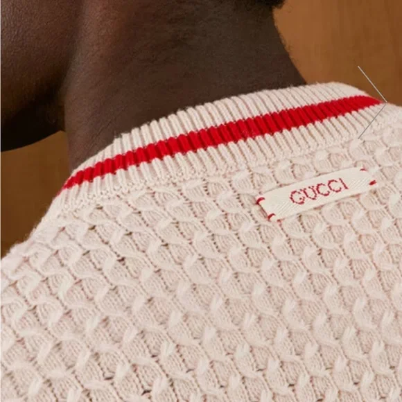 Copy and pasted from website:PRODUCT DETAILSStyle 696574 XKCFW 9176Sophisticated and subtle patterns decorate a selection of styles for the Gucci Love Parade collection. Classic elements still permeate the House's aesthetic, blending seamlessly with the contemporary for an updated yet never-out-of-style wardrobe. This V-neck cardigan has a perforated GG motif and contrast rib trim.* Ivory knitted wool* Perforated GG motif* Red trim* V-neck* Two front pockets* Rib trim* Button closure* 26.8" length based on a size m* Made in Italy* The model is 6'1" tall. The product shown in this image is a size m* Fabric: 100% Wool.* Application: 100% Polyester.
