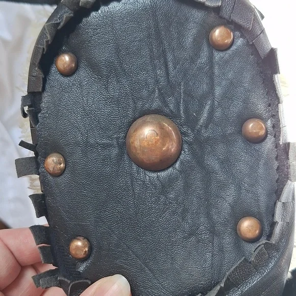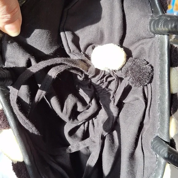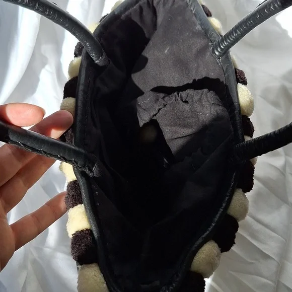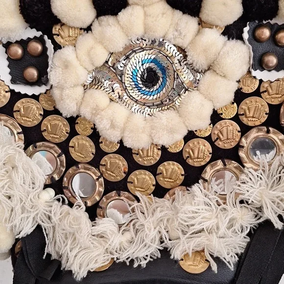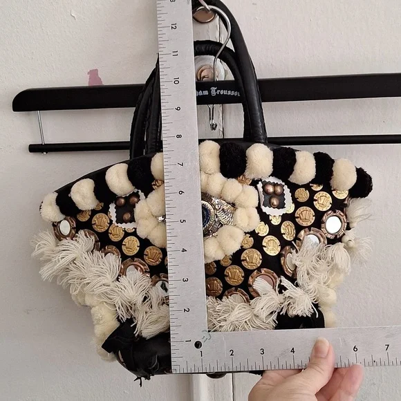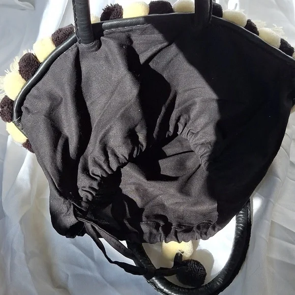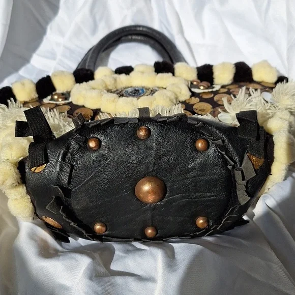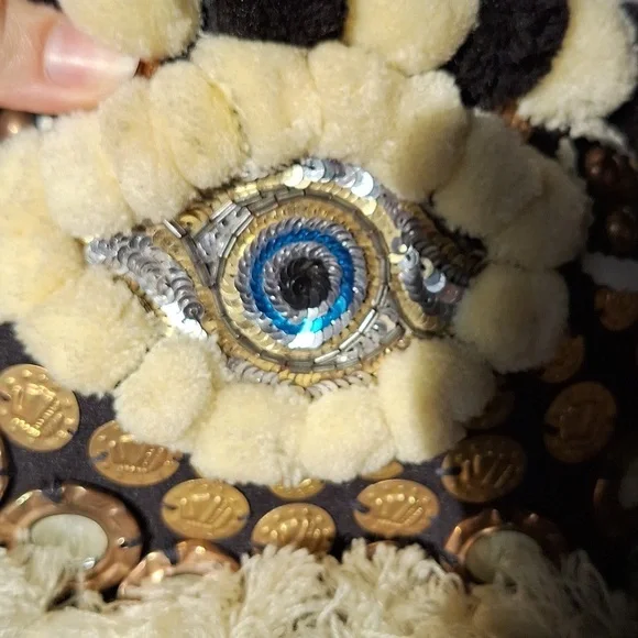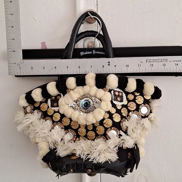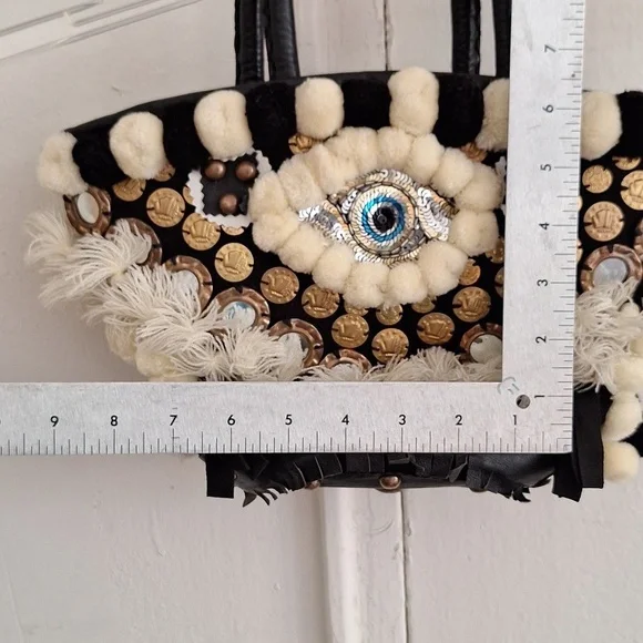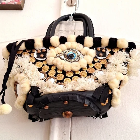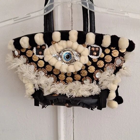 Evil eye design by Figuegorgeous conversation pieceSTATEMENT PIECEBlack, ivory color, brassdrawstring closure with string and pom pomsSold Out at Bergdoff GoodmanRARE STYLE DESIGN OOAK ONE OF A KIND BAGpom poms, tassels, mirror,Mediterranean decor, brass hardwarebrass feetreal leather trimpre owned ,with light wear only seen in photos, noticeable when wearing