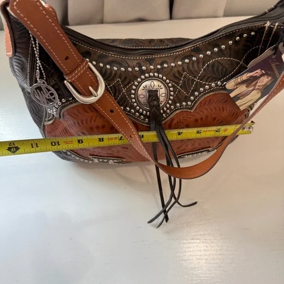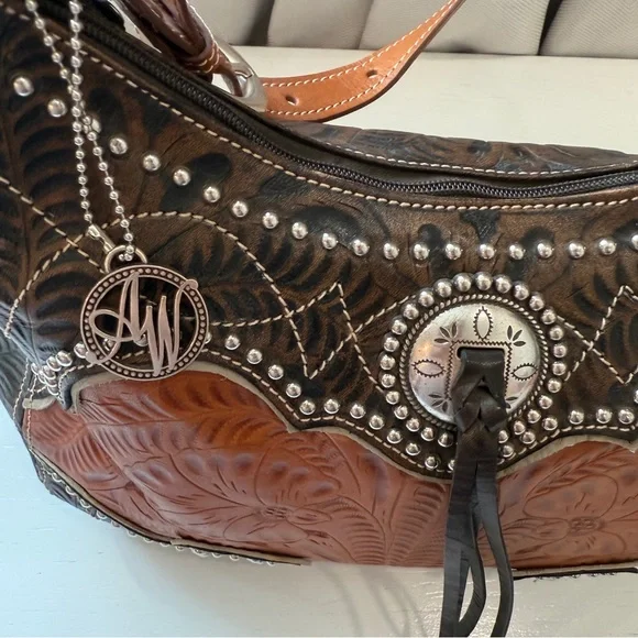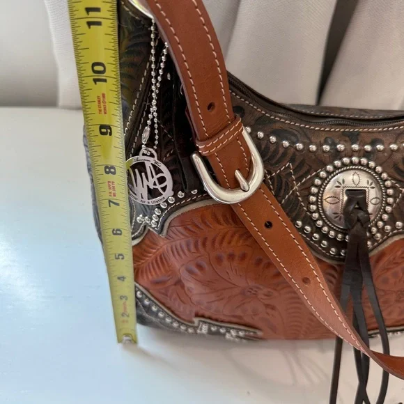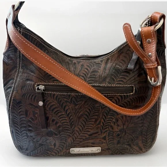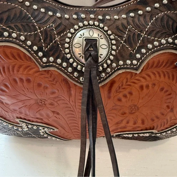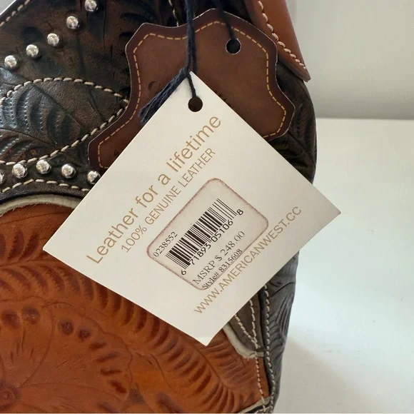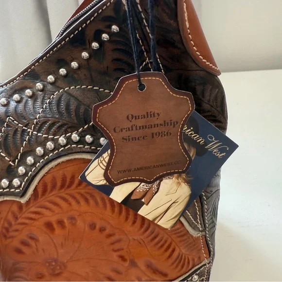 NEW American West Zip Hobo Bag Medium Brown Cognac Tooled Leather Silver StuddedGorgeous western purse. Retail price: $248. Perfect for a rodeo , festival or everyday occasion with a western theme.Measurements in the pictures.Let me know if you need more measurements.Please, see all the pictures taken at different angles for full condition and details.We do are best to present any defects or wear using photographs and description.From smoke free home.