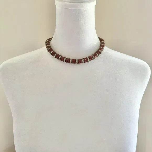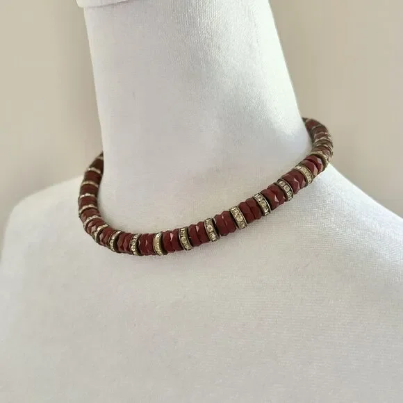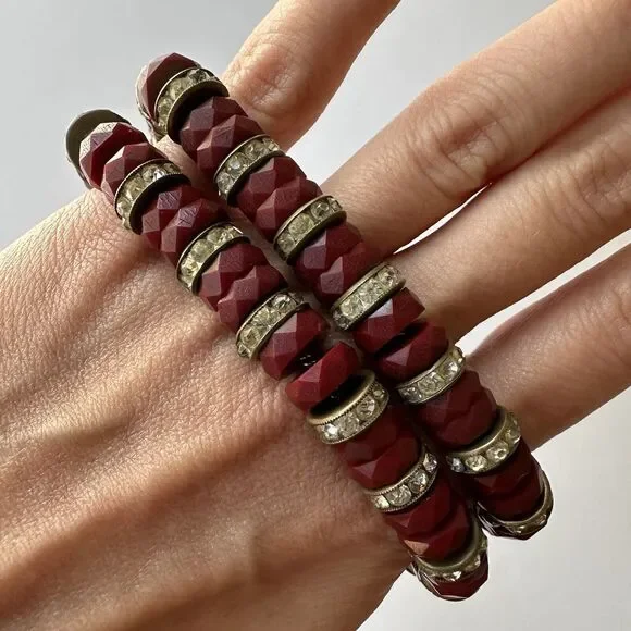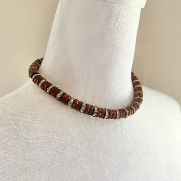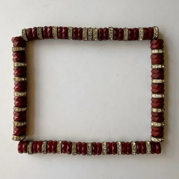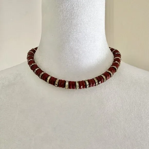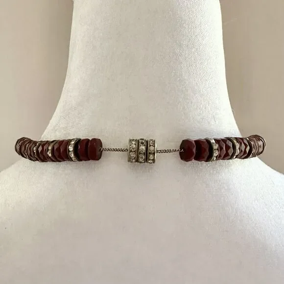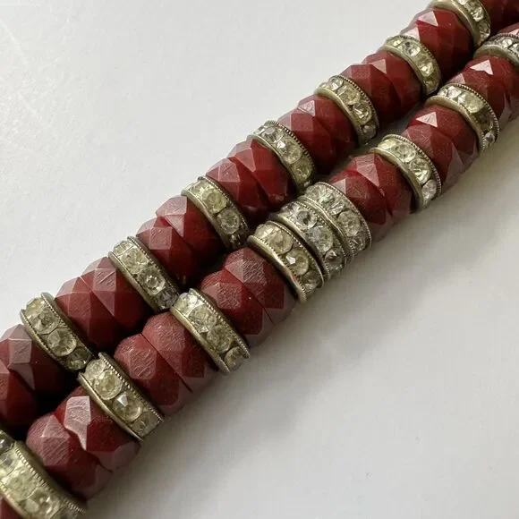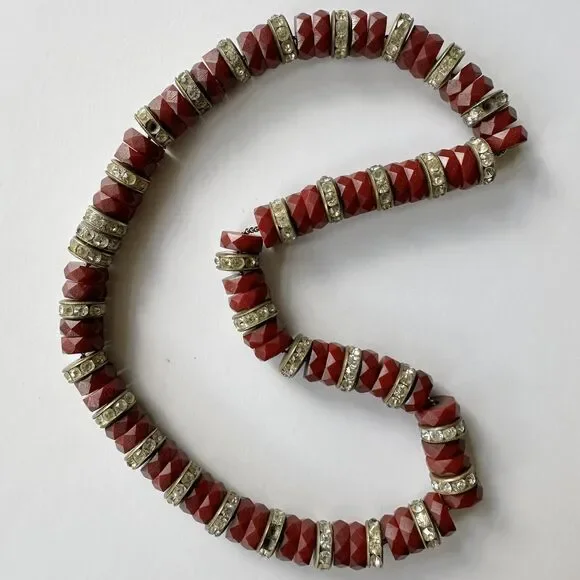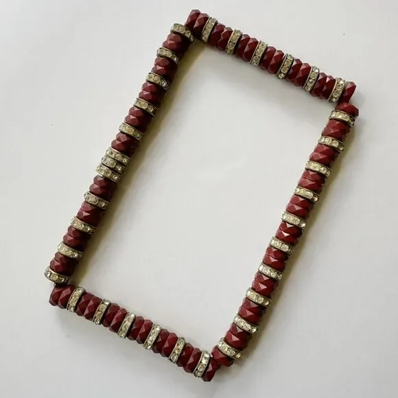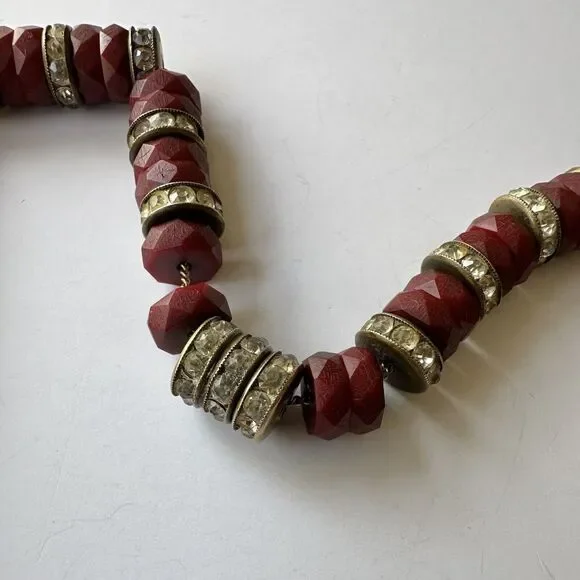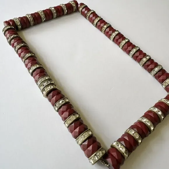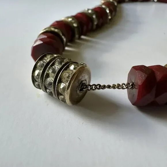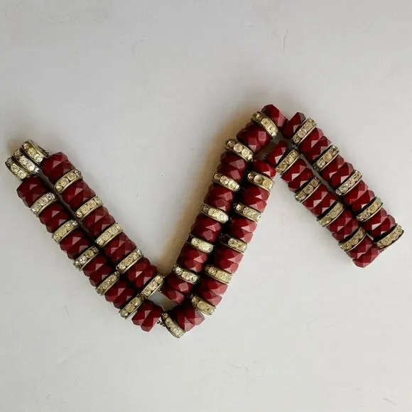 Vintage art deco necklace by Louis Rousselet from the 1920s-1930s made of burgundy red faceted galalith beads (some times referred to as French Bakelite) and rhinestone rondelles strung on a fine, original, chain and finished with a rhinestone studded barrel or screw clap. About 16 inches in length end to end, unclasped. A few of the rhinestone rondelles are missing stones. The necklace is unmarked but was made in France.