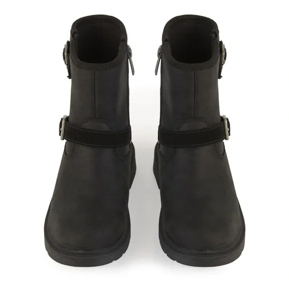 Buckle straps bring moto-cool appeal to a seam-sealed,waterproof boot designed with a convenient side zip,cushy footbed and traction-enhancing rubber sole.Waterproof: protects against rain, puddles and slush tokeep feet dry in wet conditions-Leather upper/textile lining/rubber sole-Side zip closure-Cushioned footbed