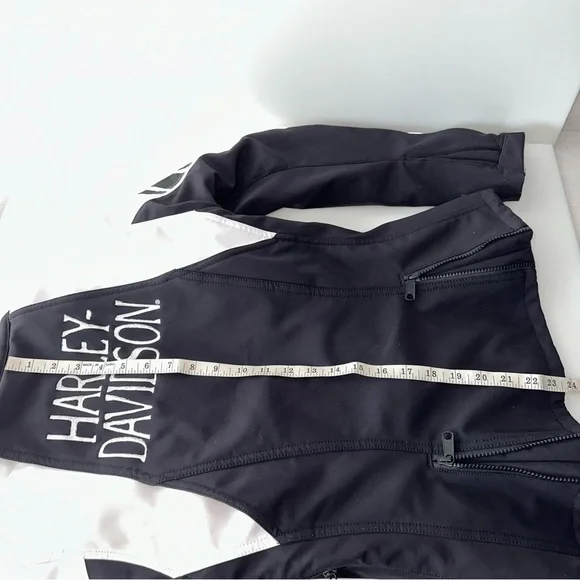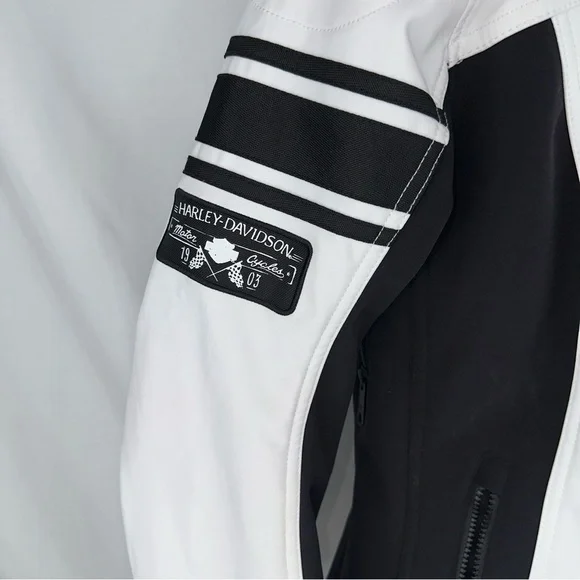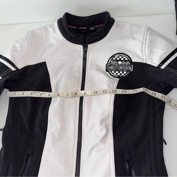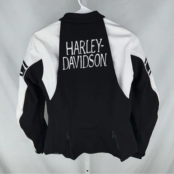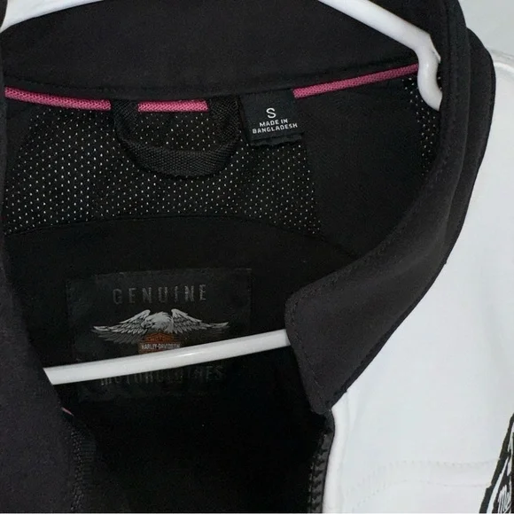 Preowned with some light wear. There is a mark on the sleeve.This Harley-Davidson women's jacket is a must-have for any motorcycle enthusiast. The jacket features a full zip and is made with high-quality materials from Bangladesh. It comes in a stylish white and black design that is sure to turn heads. The jacket is available in size small and is perfect for collectors or everyday wear. It is a great addition to any Harley-Davidson collection and is sure to impress. Don't miss out on this opportunity to own a piece of Harley-Davidson history.M414 on e and pm