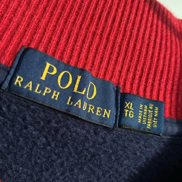 -Style: Varsity Embroidered Bomber Jacket-Worn Once-Brand: Polo by Ralph Lauren -Size: XL-Color: Navy Blue and Red-Made in: Vietnam -Material: 84% Cotton, 16% Polyester -Pit to Pit: 25”-Length: 28”-Sleeve: 25”-Tags: Pastel, Classic, Retro, Casual, Lounge, Streetwear, Transitional, Comfy, Basic, Designer, Golf, Dress up, Date night, Vintage, Active wear, Performance, Yoga, Hiking, Medical, Work, Cargo, Business Casual, Vacation, Distressed, Rare, Thrift, Tags, Labels, Pristine, Worn, Y2K, 70s, 80s, 90s-Additional Information: If you need any additional information on this item, please comment below. I am more than happy to provide requested Pictures, Videos or Measurements. SAME DAY SHIPPING!