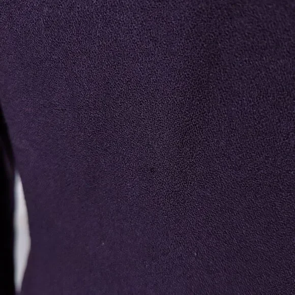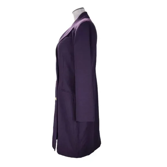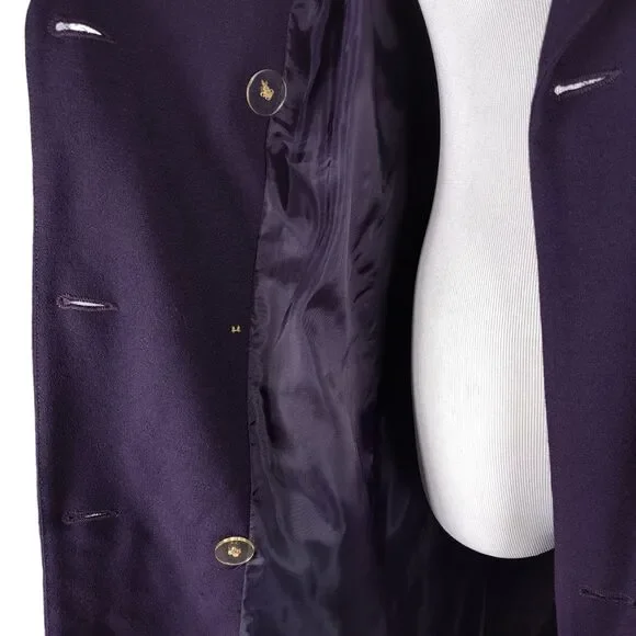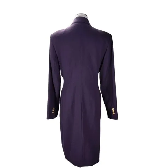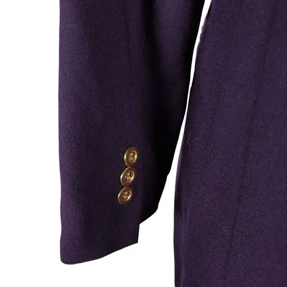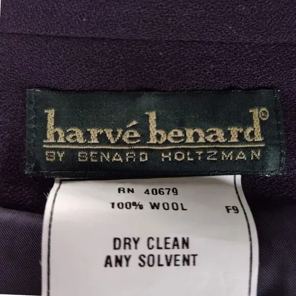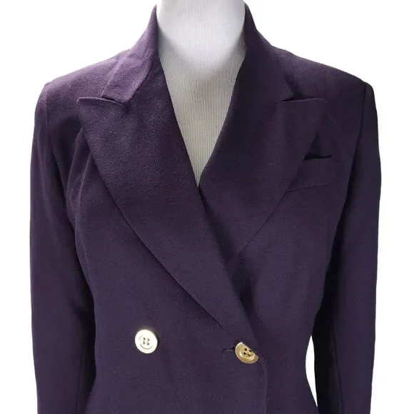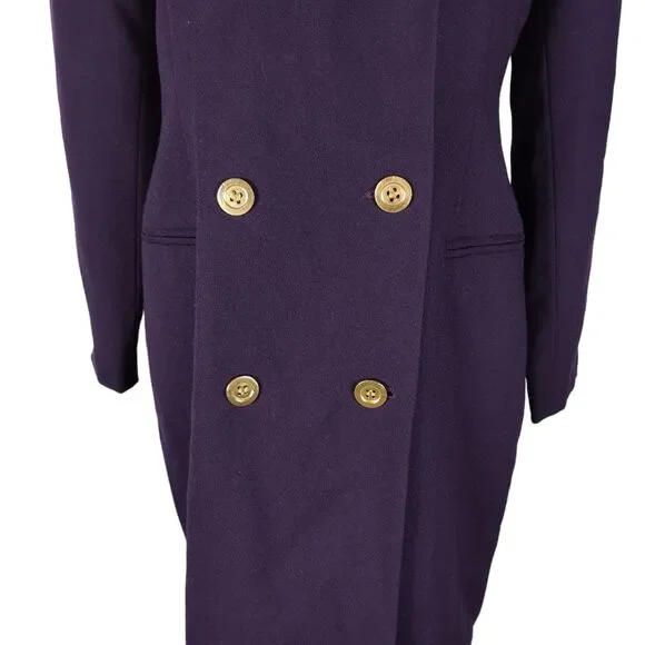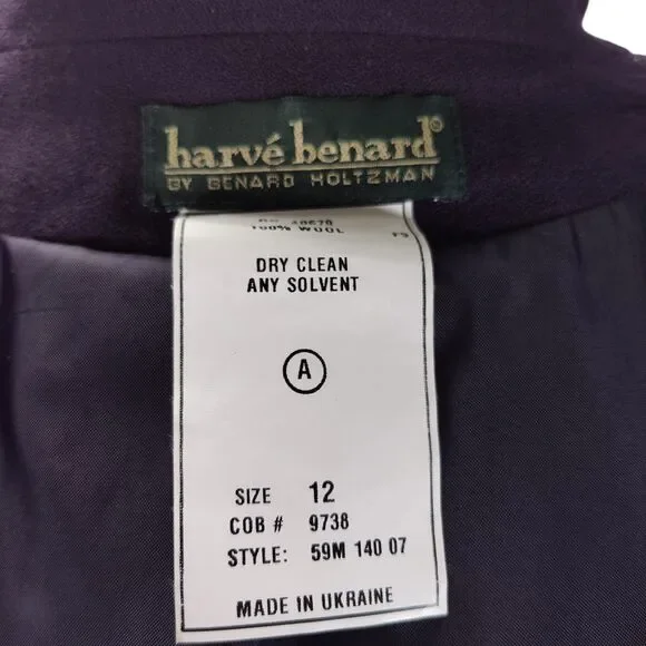 Brand: Harve BenardColor(s): purple similar to eggplantTag size: 12Fabric/Care: 100% Wool; Dry Clean, Made in UkraineVintage 90's blazer dress in a wool crepe material. Long sleeve, double breasted with a peak lapel, two welt pockets, fully lined with light shoulder pads, the buttons are gold plastic but could be replaced with metal buttons if desired. One small pull and missing the inner center button. Does not stretchActual measurements flat then doubled:* bust: 40in* waist: 34in* hip: 44in* length: 38in* sleeve: 23.5in* shoulder: 17in