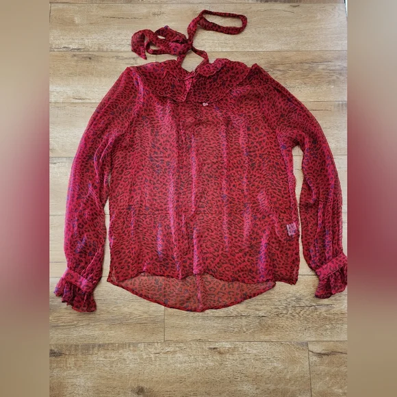 Johnny Was 100% Silk Sheer Blouse Top Neck Bow Tie Animal Print Bell SleeveRelaxed and laid down pit to pit 24in, length 25inThis Johnny Was 100% silk blouse top features a unique leopard red animal print, ruffle accents, and a stylish bow tie neckline. Made of lightweight chiffon fabric, this pullover top is perfect for various occasions including travel, parties, casual outings, and workwear. The sheer design adds a touch of elegance to the top, making it a versatile and stylish addition to any wardrobe. With its classic yet hipster vibe and bohemian flair, this blouse is a must-have for those looking to add a playful and colorful twist to their fashion choices.