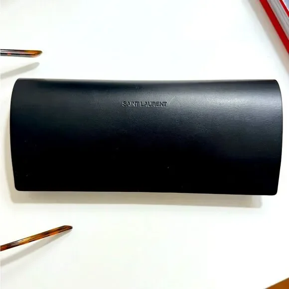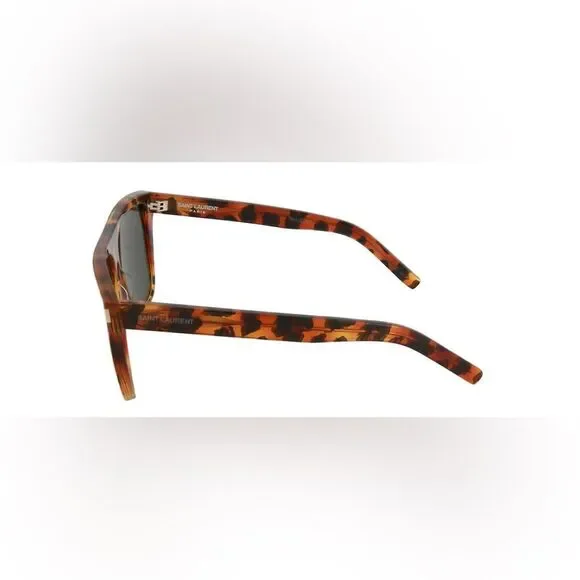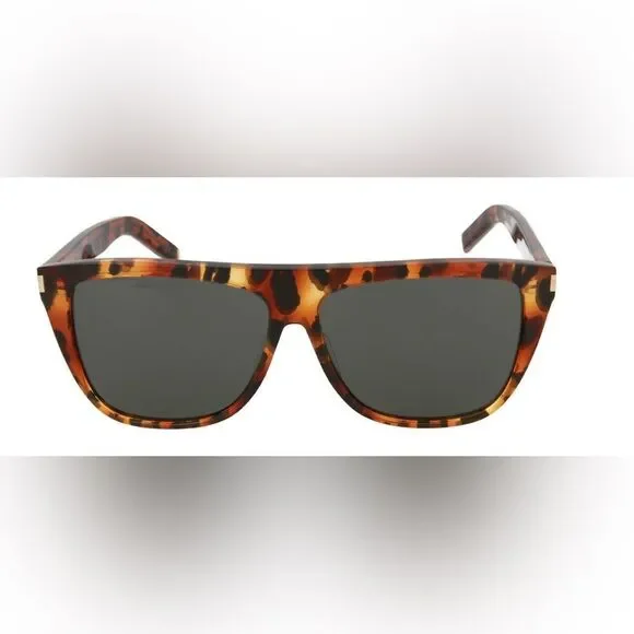 Saint Laurent sunglasses with a flat-top, thick tortoise frame and mineral glass lenses. They are made in Italy from 100% acetate and have the following features:Lens color: GreenFrame color: Amber tortoiseProtection: 100% UVA/UVBCorner angles: MetalTemples: Saint Laurent's signature engraved templesMINT condition!