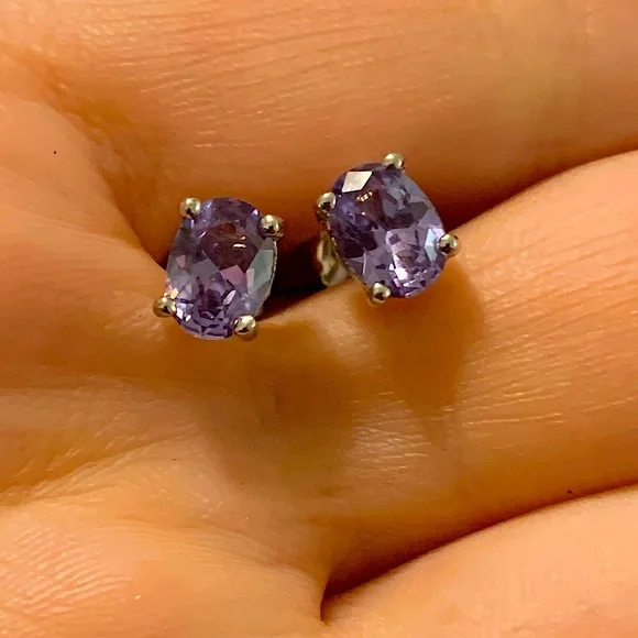 Gorgeous elegant and minimalist solitaire earrings NWOT The famous color changing Alexandrite is breath taking!* 1 carat total color changing created Alexandrite (7mm x 5mm)* 18k white gold plated* 925 Sterling Silver Hallmark Stamped* Green blue to blue green and violet in normal lighting * Purple Pink to flashes of Ruby under a flashlightRelated: birth stone crown chakra rainbow blue purple red citrine emerald sapphire peridot orange yellow green Hunter crystal healing effect Gemini fire flash gemstone fine jewelry mercury light multi multicolored color change pale moon rare strong magic zodiac enchanted jewelry gift present for wife girlfriend fiancé special occasion date night fine jewelry diamonds sparkly moissanite valentines birthday anniversary present size ring engagement wedding Alexandrite emerald baguette vintage antique estate retro classic career chic gold silver rose gold matte 925 precious metals luxe Cartier levian Louis Vuitton certified Kay jewelers Disney Disney treasures expensive luxury rare designer beautiful gorgeous elegant boho minimalist gypsy distressed metallic embellished graduation bridal chunky trillion curvy curved triangle cut radiant