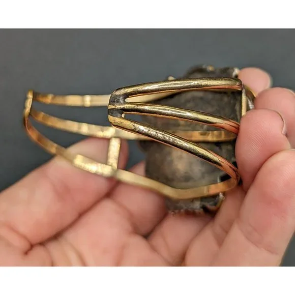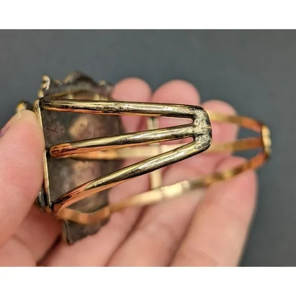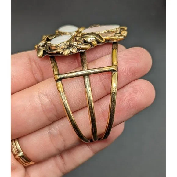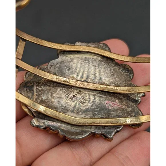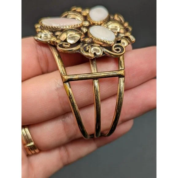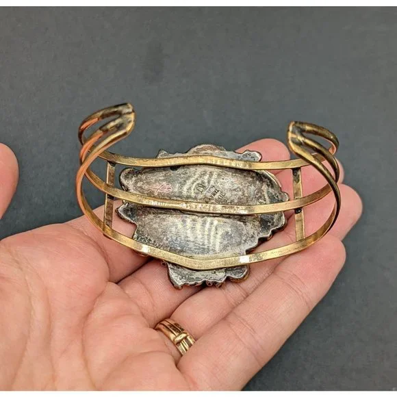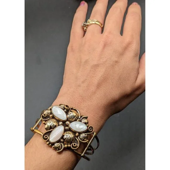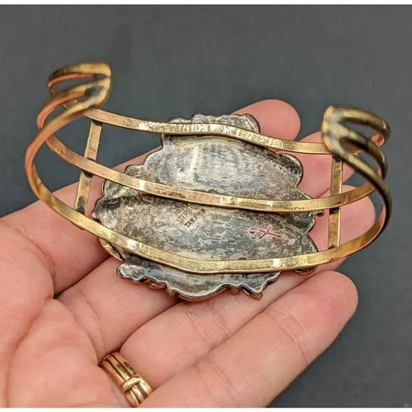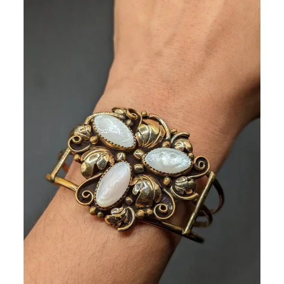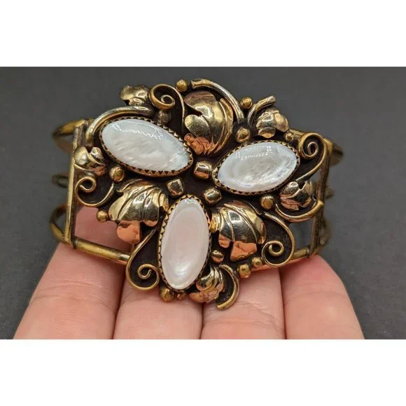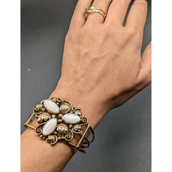 Tawa by KT Navajo Sterling Gold Filled Mother Of Pearl Swirl Leaf Cuff Bracelet. It's about 5-1/2" end to end, i.e., not counting the gap. It adjusts so it should fit most wrists. This bracelet has not been cleaned and made benefit from a quick polish. It weighs 31.8 grams. Please use the pictures as your main source of reference, but feel free to message me with any questions at all. Thanks for looking!