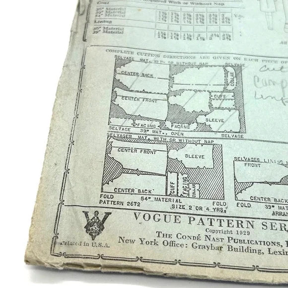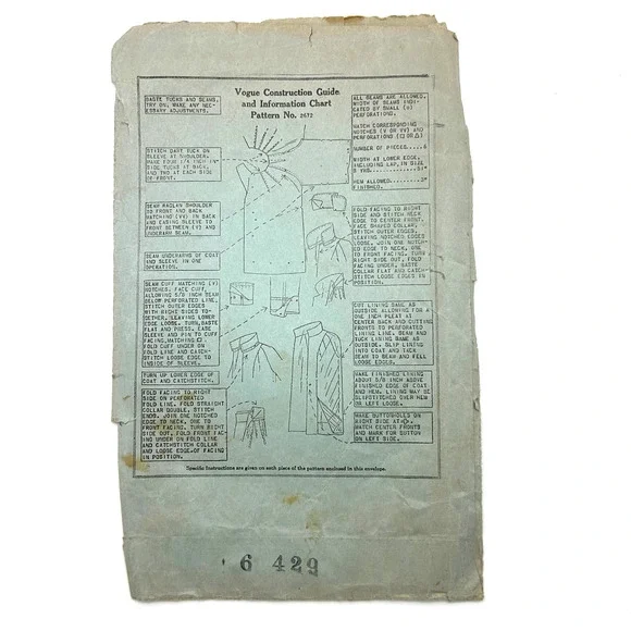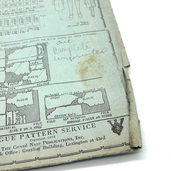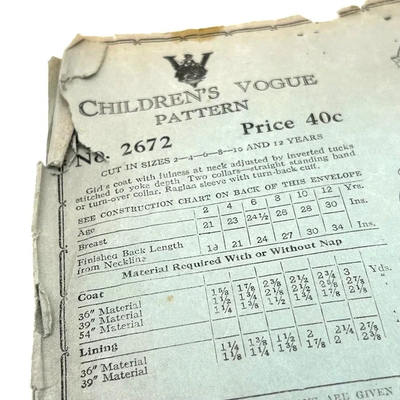 Antique Vogue Pattern #2672 Childrens Coat-1929-Hard to find EXTREMLY RARE-Size Age 4 Years-CompleteCutUnprintedCONDITION: Excellent condition. Pre-owned. Envelope in poor condition. Vintage patterns may have some yellowing due to age. Please see photos as they are a part of the description.SIZE INFORMATION: Please see photos for sizing and more information. Vintage clothing sizes usually run small. See measurements on the patterns before purchasing.SKU: PT-0604-R
