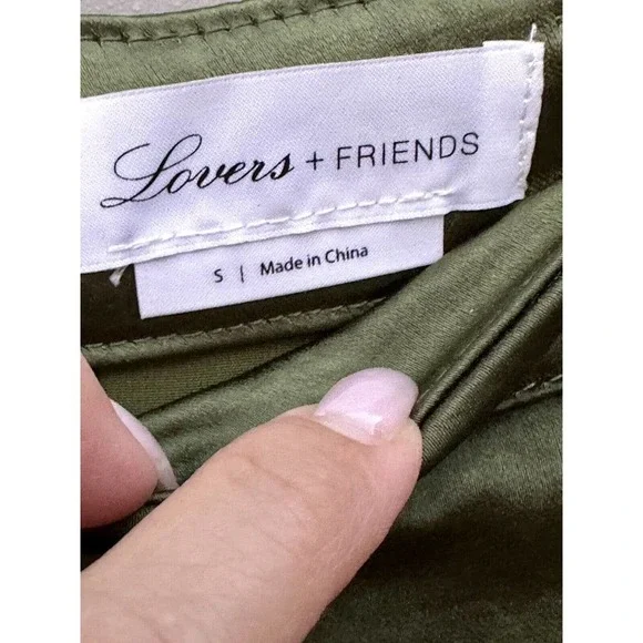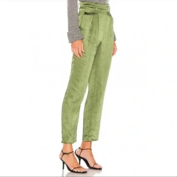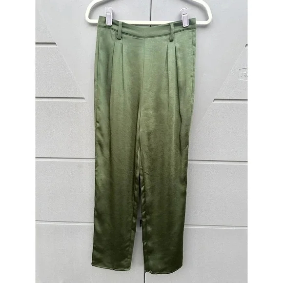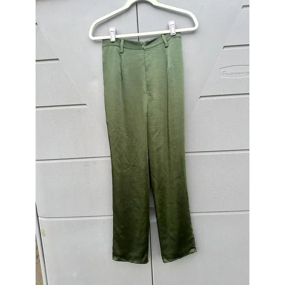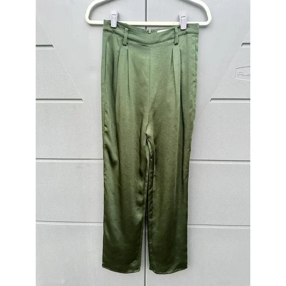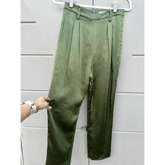 Lovers and Friend Overland High Waist Dress Pants in Olive Green Satin Sz SmallElevate your ensemble with these Olive Green Satin Dress Pants from Lovers + Friends. These pants feature a high waist, pleated front, and tapered leg with a relaxed fit, making them perfect for any occasion from casual to business wear. The pants are made of a comfortable polyester blend material and have a zip closure.The pants are solid-colored and come in size Small with a waist size of 28 inches and inseam of 25 inches. The pants have a mid-rise of 8.5-10.5 inches and have slanted pockets for added convenience. The pants can be paired with any top to create a contemporary, city, hipster, minimalist, or classic look.