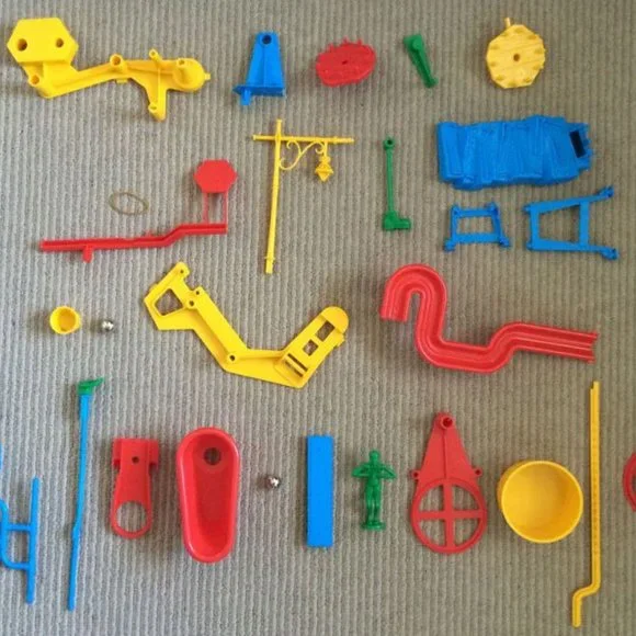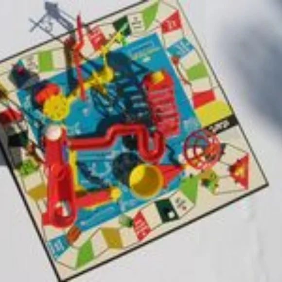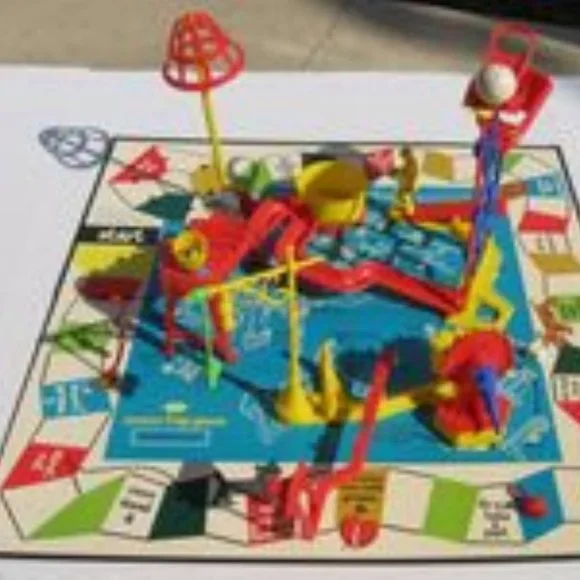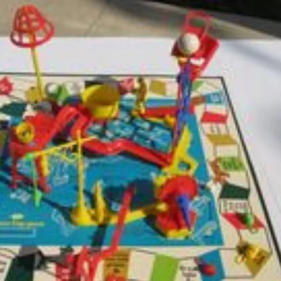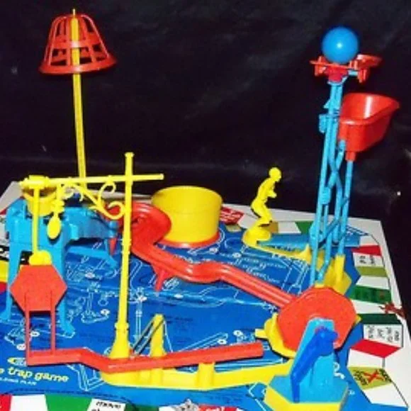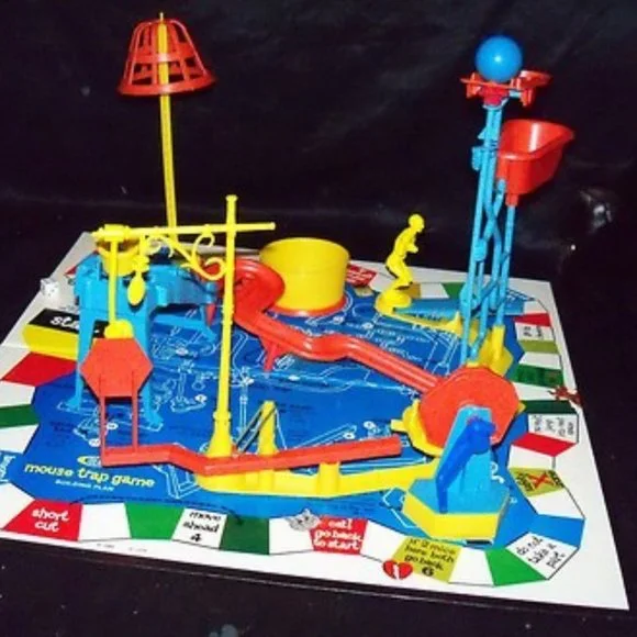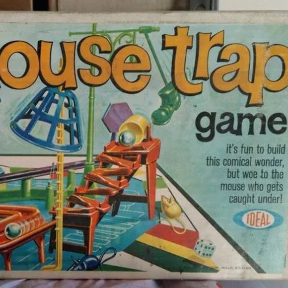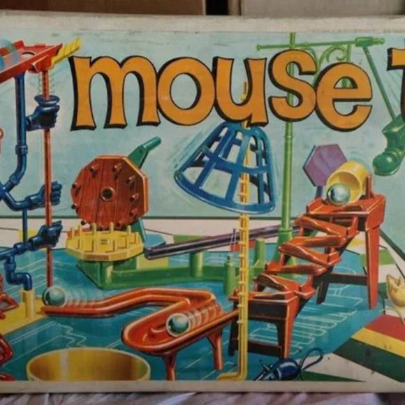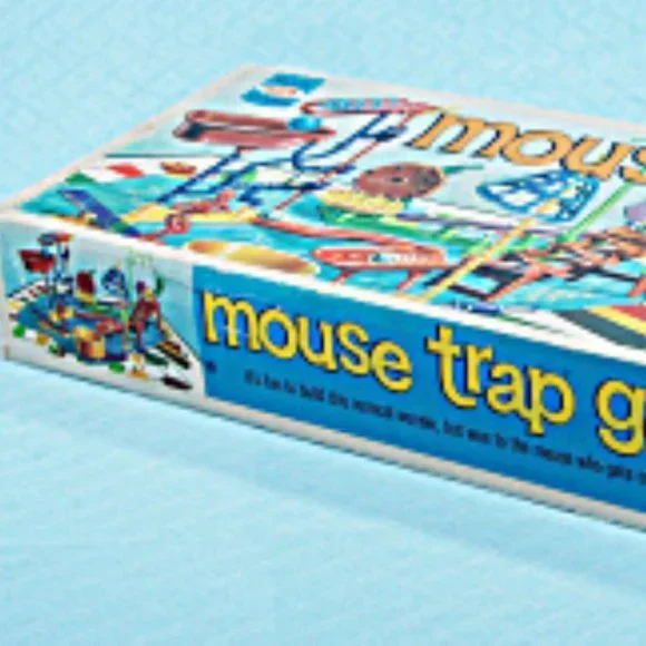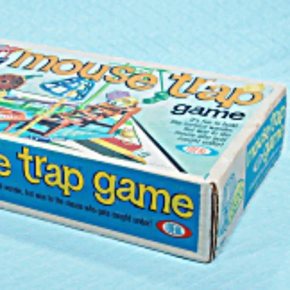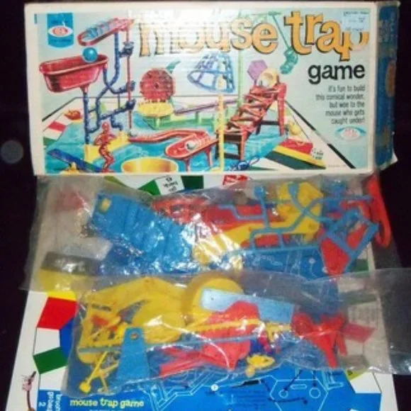 Mouse Trap Board Game IDEAL 1975 Rube Goldberg Marvin Glass Collectible. This 1975 Mouse Trap Board Game version came in a box with a side flap. This game was a gift, box was opened and all parts were inspected, but the game was never played with. All parts are there, game is complete. Outer box may show some shelf wear as it was shuffled around on a shelf from time to time. These 1975 versions of the Mouse Trap Game are out of stock on websites, hard to find in consignment shops, online, auction sites, etc., making this one a real collectible because it is in great vintage condition. Designed by Gordon A. Barlow, Marvin Glass*, Harvey "Hank" Kramer, and Burt Meyer. Stored in a cool, dry place. Comes from a smoke-free/pet-free home.Description:Mouse Trap pits 2-4 players against each other as mice trying to navigate through a complex mousetrap. They build the Rube Goldberg inspired mousetrap as they move their mice across the board. They also try to collect cheese cards, which allow them to move other mice to cheese wheel which is the bait for the trap. Once the mousetrap has been completely constructed, players can attempt to capture each others' mice in it by turning the crank, which activates the mousetrap. If the mousetrap doesn't malfunction, the mouse is captured and out of the game. The winner is the last mouse who avoids being trapped. The main appeal of Mouse Trap is the ridiculously complex contraption that is the mousetrap.